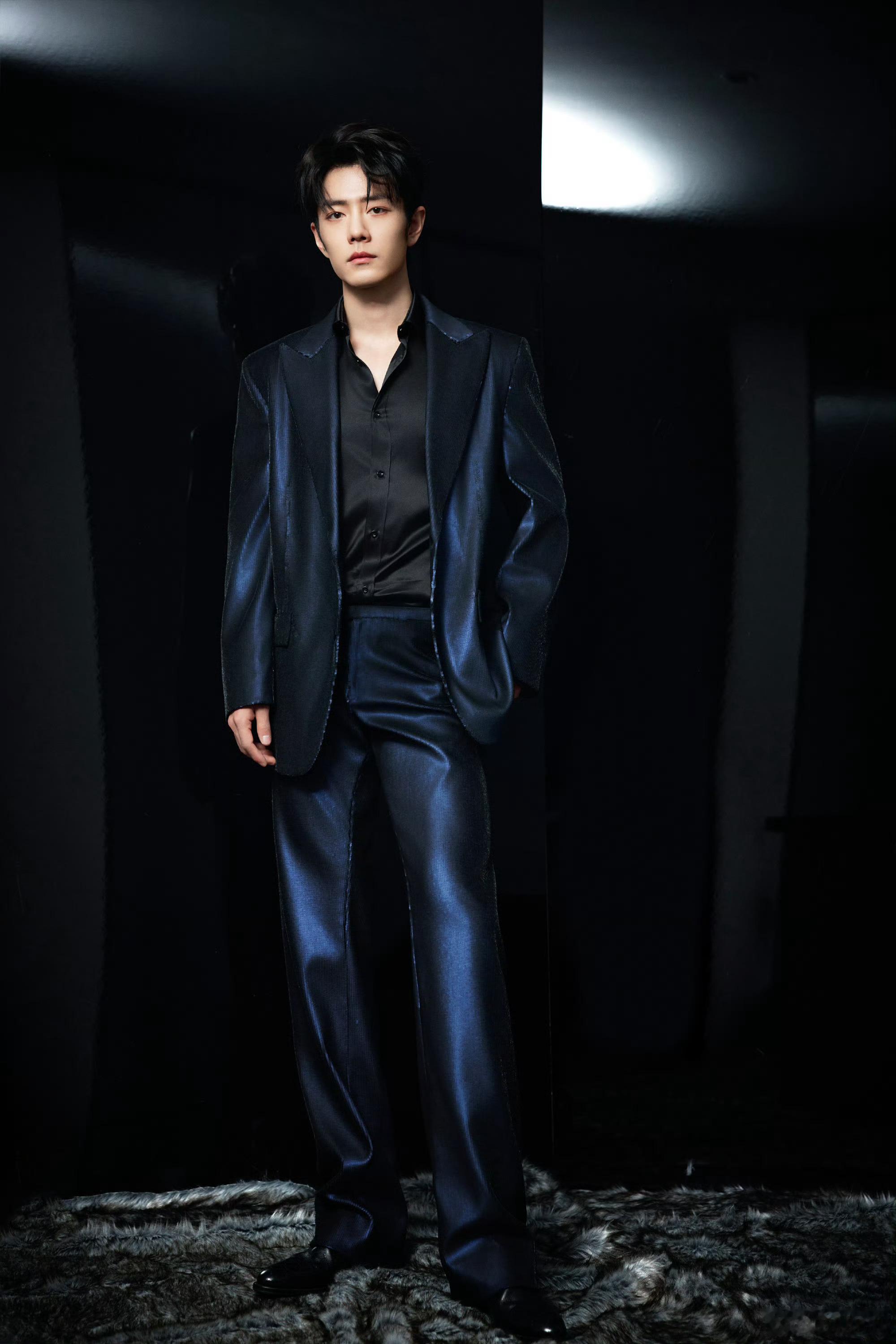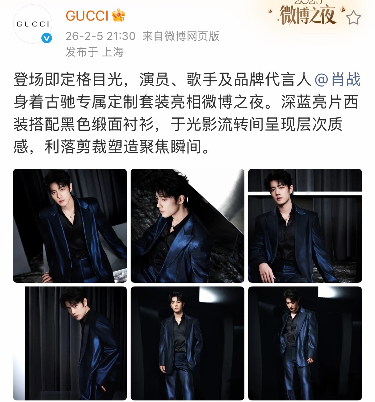 肖战身着古驰专属定制 肖战微博之夜第二套身着古驰专属定制,深蓝亮片西装搭配黑色缎