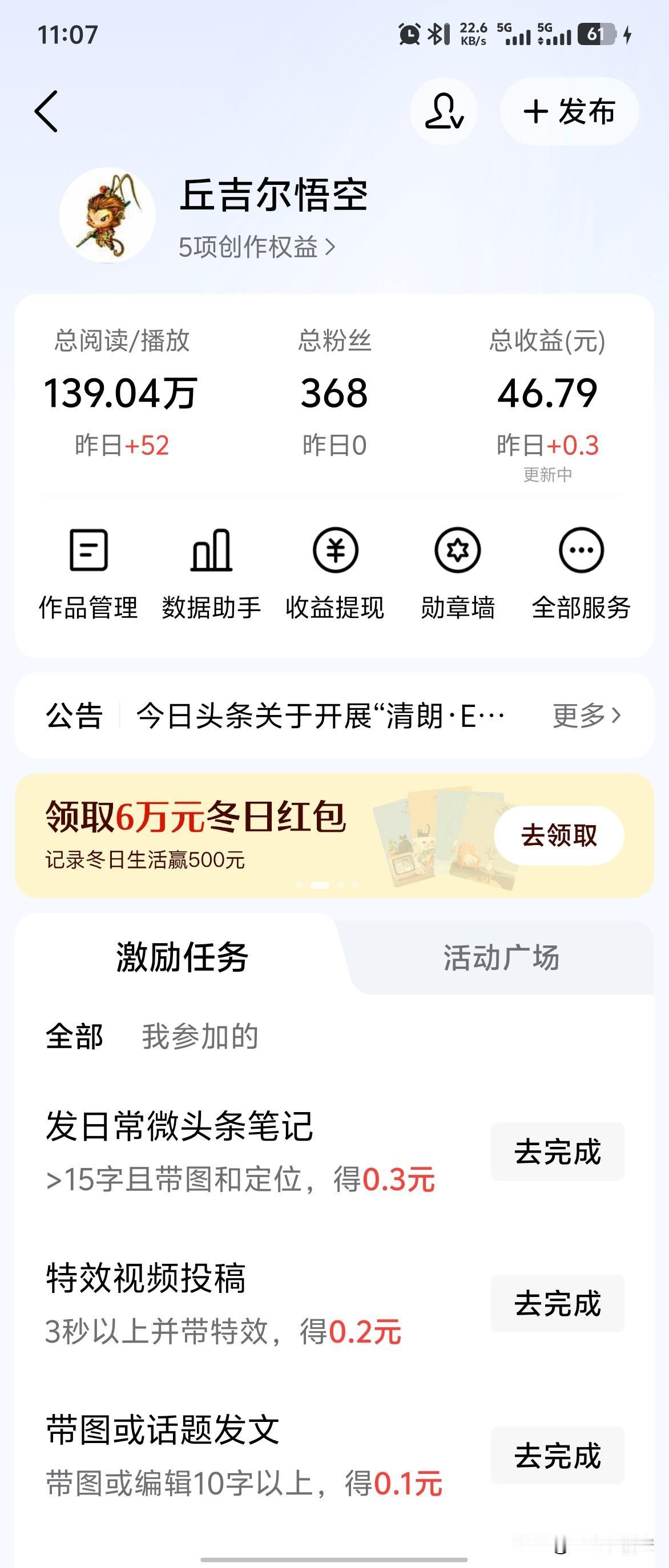 累计209个作品 139万阅读量 8篇文章201微头条 累计收入就这点 没脸看 46.79元[我想静静] 最近一个月21万展现 5800阅读量[石化] 只有过几篇小爆文章 从一开始只为玩玩 到后来越来越在乎数据 也看清了确实不是这块料 再坚持一两个月吧 也算是对自己有个交代