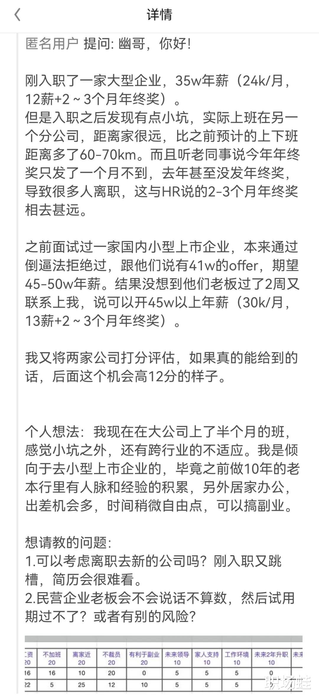 “个人想法:我现在在大公司上了半个月的班,感觉小坑之外,还有跨行业的不适应。我是倾向于去小型上市企业的,毕竟之前做10年的老本行里有人脉和经验的积累,另外居家办公,出差机会多,时间稍微自由点,可以搞副业。”