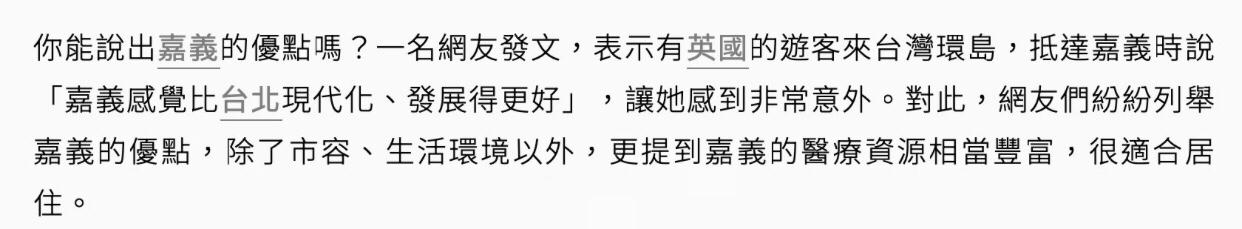 台媒:英国人认证,一名网友发文称,有英国游客来台湾岛旅行,抵达嘉义时说“感觉嘉义比台北现代化、发展得更好”,这让她感到非常意外,台北输了,嘉义居民点出关键,“市容环境好、医疗卫生资源丰富,好住又好吃”。