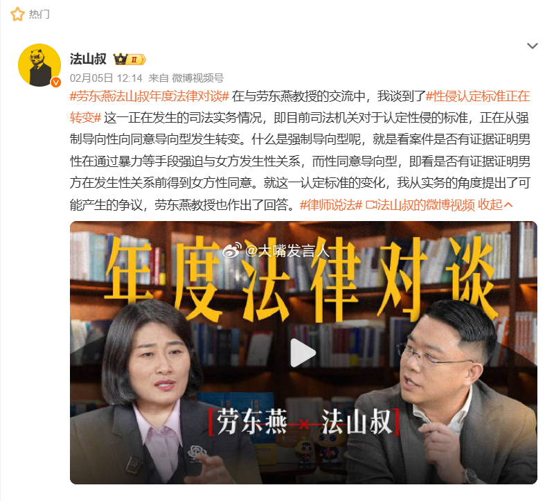 劳东燕法山叔年度法律对谈 目前我们刑法对强奸罪的认定,还是“以暴力、胁迫或其他手段违背妇女意志强行发生性关系”。说什么“是否有证据证明男方在发生性关系前得到女方性同意”,我就问这些学者,“同意可以撤销”(图1),这句话你们认同吗?知道这句话是谁说的吗学者解释法律,务必严谨、慎重,不要像罗老师那样,前些年支持废除死刑(图3),后来变成又同意保留死刑。那么,在罗老师思想转变之前、受到他废除死刑影响的法官们,判的那些案子怎么办?性侵认定标准正在转变 ,律师说法,热点观点