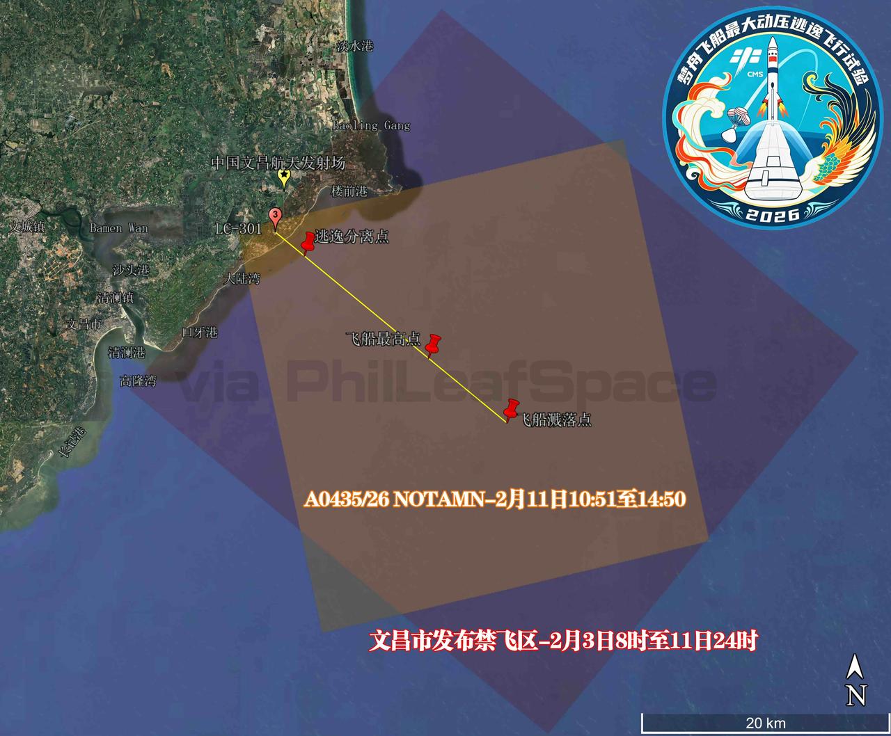 CZ-10/梦舟MaxQ逃逸试验箭细节,从上到下依次是:逃逸塔、返回舱、服务舱模拟段、级间段(配置栅格舵*4+回收钩*4)、一级配重段、一级动力段(系留点火静点箭)。 文昌航警已发布!禁飞范围为图2-3所示的橙色区域,时间为2月11日10:51~14:50。 当天除梦舟MaxQ逃逸试验外,还将同时开展验证一级火箭回收技术的CZ-10系火箭低空飞行试验任务。“领航者号”回收船及相关打捞船只现已到达火箭预定溅落海域,该海域到发射场直线距离约370km,这意味着此次VTVL试验箭的最大飞行高度将达到70~90km,远高于梦舟飞船的20~30km(说明在梦舟MaxQ逃逸分离后,火箭还会继续保持一段时间的动力飞行)。