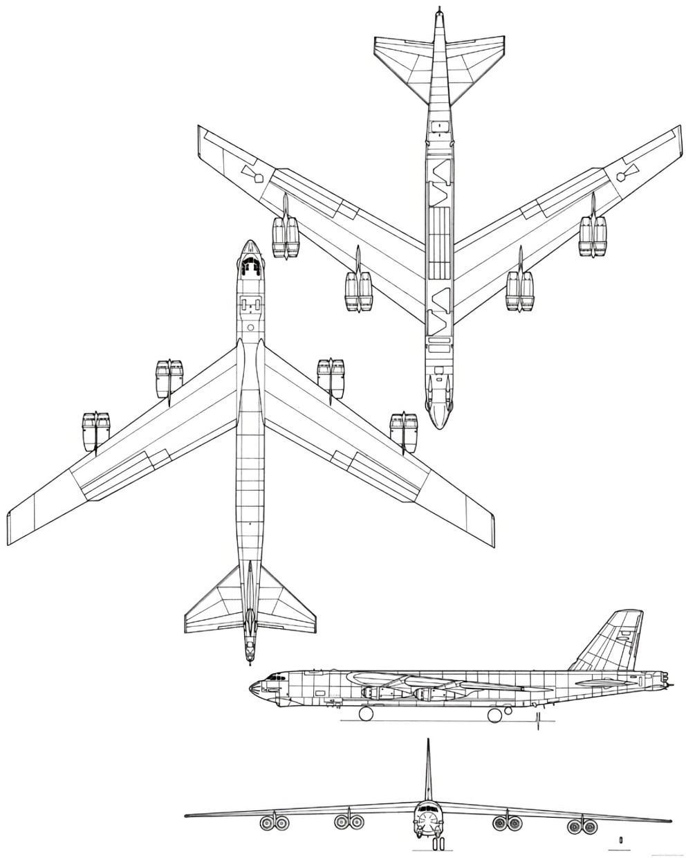 B-52轰炸机的机身结构为细长的全金属半硬壳式,侧面平滑,截面呈圆角矩形。前段为气密乘员舱,中段上部为油箱,下部为炸弹舱,空中加油受油口在前机身顶部。后段逐步变细,尾部是炮塔,其上方是增压的射击员舱。动力装置为8台普惠TF33-P-3/103涡轮风扇发动机(单台推力为76千牛),分4组分别吊装于两侧机翼之下。B-52轰炸机不同型号的尾部装有不同的机枪,如G型装有4挺12.7毫米机枪。该机载弹量非常大,能携带31500千克各型核弹和常规弹药。