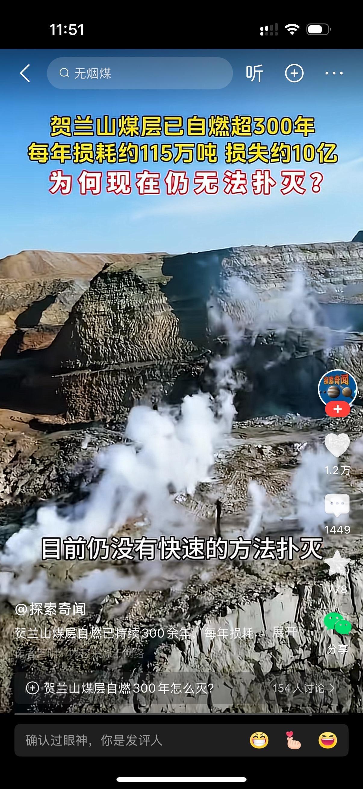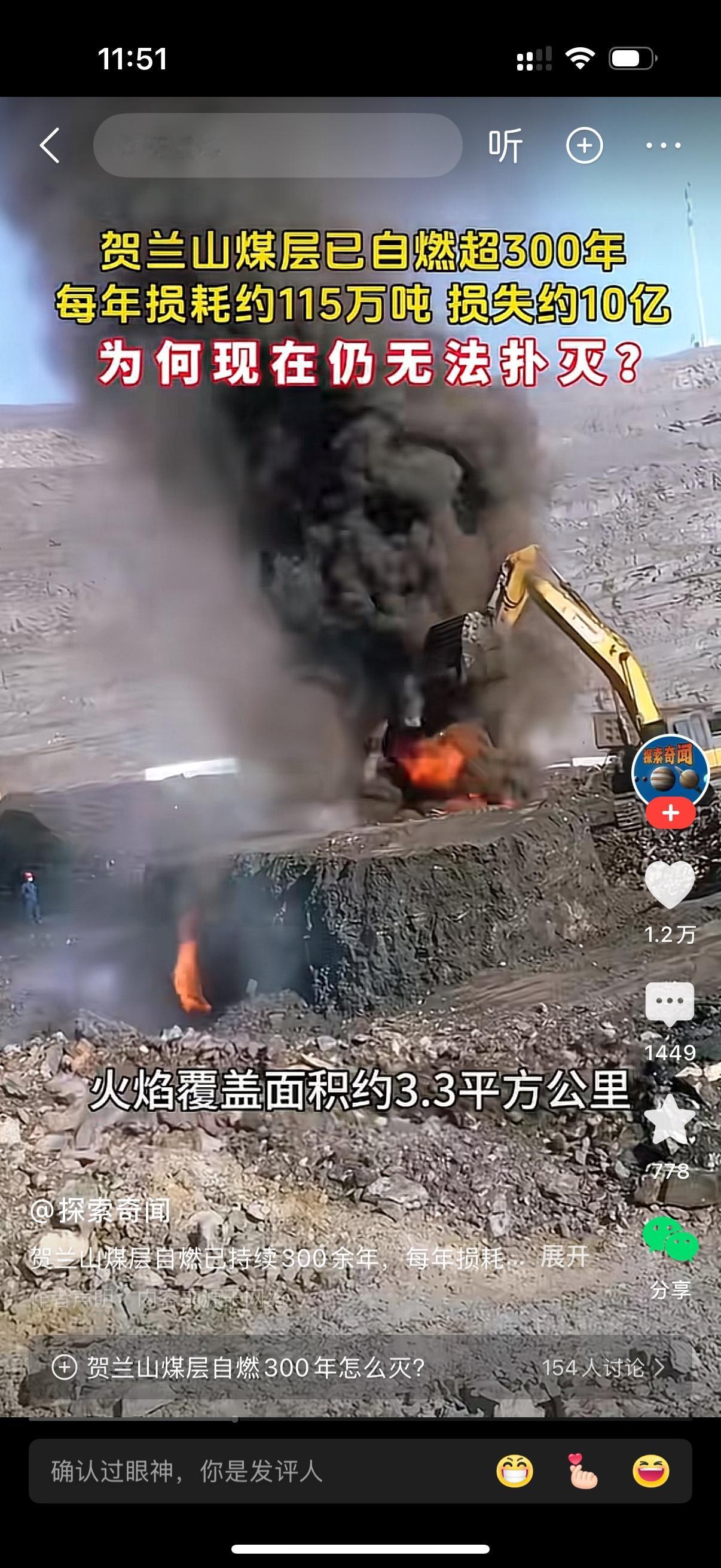 贺兰山的煤层自燃,从清朝烧到现在,足足超300年了,火区覆盖面积3.3平方公里,最深烧到地下280米,每年白白烧掉115万吨优质太西煤,直接经济损失近10亿,这笔账算下来真的触目惊心。很多人纳闷,这么大的损失,为啥就不能快速扑灭?其实真不是不想灭,是条件太复杂,根本没法一蹴而就。 首先这火不是地表明火,是藏在山体和地下煤层里的暗火,还有早年小煤窑留下的无数巷道、裂缝,空气源源不断灌进去助燃,火点分散又隐蔽,根本找不到所有火源。其次这里的太西煤活性极高,氧化放热快,还伴生瓦斯,一有氧气就复燃,浇水只会瞬间汽化,甚至分解出可燃气体帮着烧,常规灭火手段完全没用。 再加上贺兰山是生态屏障,不能大动干戈爆破开挖,大型设备也难进山,只能靠钻孔注浆、注氮隔氧、覆土封缝慢慢治理,只能控火蔓延,没法一次性彻底扑灭。 每年十几亿的资源就这么烧没,实在可惜。目前只能持续开展综合治理,一点点啃这块硬骨头,想要彻底熄掉这团百年地火,还需要漫长的时间和巨大的投入。
