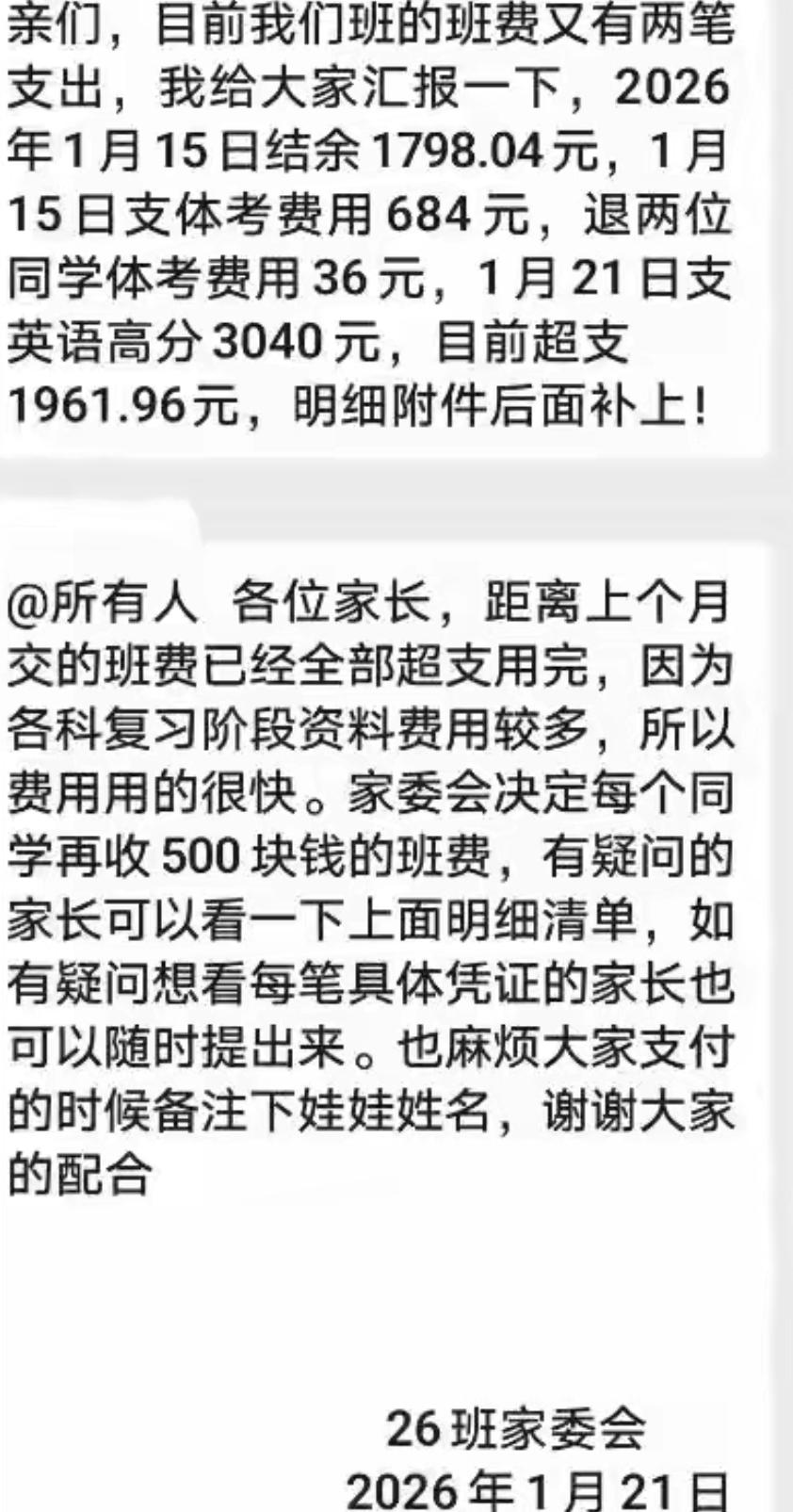 重庆一家长举报家委会,3年间收了10多万元班费,主要用于购买学习资料和复印费。 从曝光出来的信息上看,学校是重点初中,一个班级约40人,三年共6个学期收了10万,平均下来每个学期约是1.7万。 再细算,平均到每个人每个学期大约是425元左右,有明细,初中语文,英语,数学,物理,化学,历史,政治,生物,地理,共九科,平均一科不到50块一学期。 据说巴蜀那地学校是自编教材,好多资料要打印,收费开支正常不正常不知道,只知道我这地的孩子重点初中没收过这么多班费,重点高中也没有。 不说初中了,高中班费确实是由家委代收,每次买东西家委都是把明细发到家长群,收到了多少用了多少还剩多少。 班费除了买学对资料,还有学校搞活动买道具,交电费,买收纳盒等等,高中三年下来收了大约800多,不过班级有60人,算下来还是没那么多。 家委固然是有点辛苦的,班级老师不参与这个,一个是为了避嫌,一个也没时间,有时费用没到位家委还要先垫,还要一个个联系家长。 有明细就不怕查账,于情于理即便费用有点出入,只要差异不大不用深究,但有家长举报了,该查查,给所有家长一个交待的同时,也警醒所有家委,不要搞小动作。 家委会变相收费 家委会记录