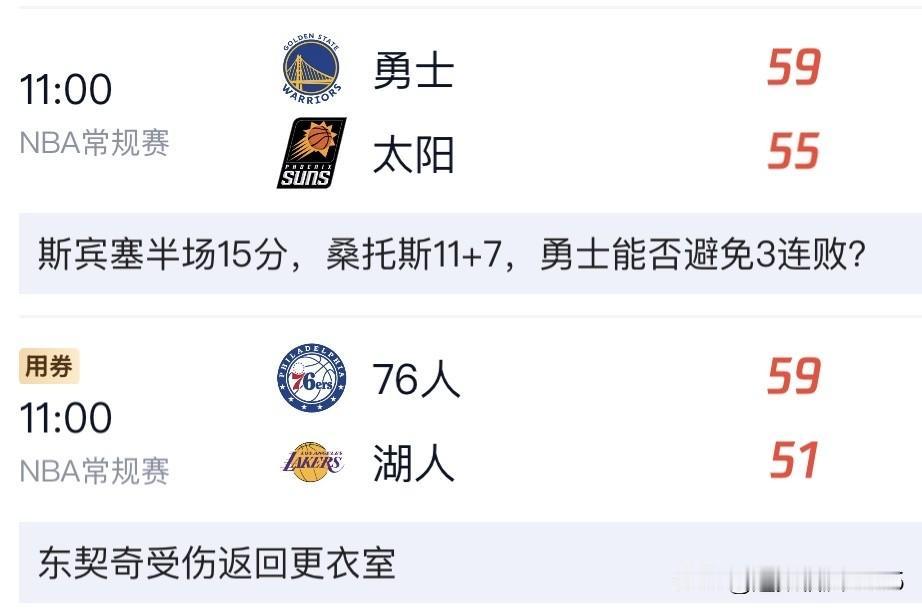 第二节东契奇意外受伤返回更衣室,上半场打完湖人51:59落后76人。 中场休息