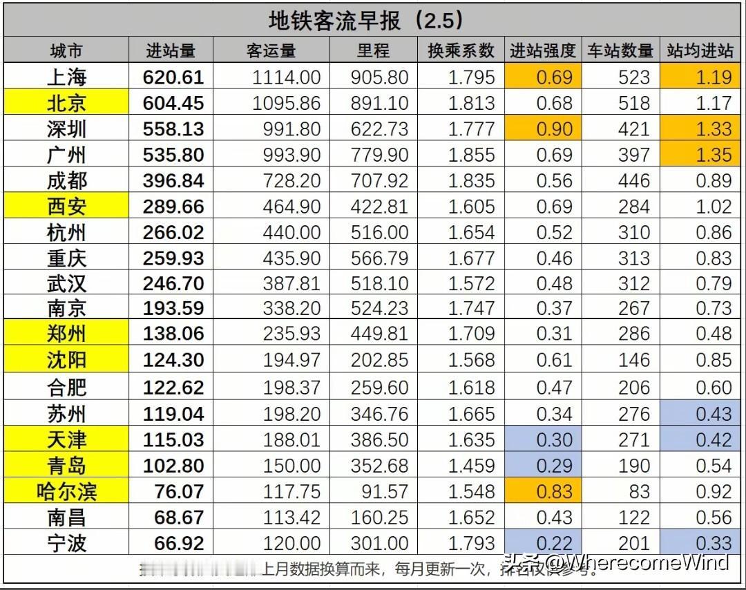西安,武汉地铁换乘系数, 让两地客流难以有所表现。 地铁客流前十的武汉,西安, 换乘系数是最低的。 武汉仅仅是1.572, 西安不过是1.605。 0.1的换乘系数, 400万客流就相差40万。 而进站量, 才是衡量乘坐地铁人数的真实数据。