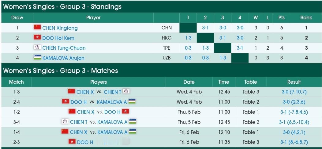 陈幸同、杜凯琹晋级淘汰赛! 第35届国际乒联亚洲杯比赛正在进行,女子第三组比赛全部结束,国乒陈幸同以小组第一出线,晋级淘汰赛! 陈幸同战胜了杜凯琹、简彤娟、卡玛洛娃,取得三战全胜战绩,表现上佳!杜凯琹在今天比赛中力克简彤娟,以小组第二战绩出线! 恭喜,淘汰赛对手在今晚抽签确定! 加油国乒!