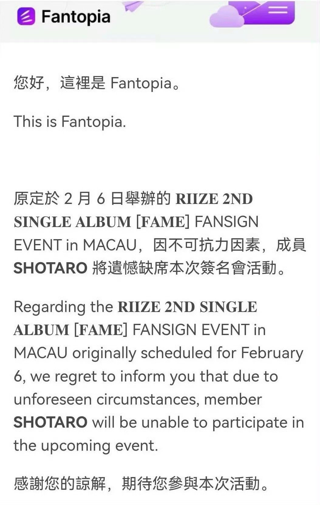 将太郎缺席RIIZE澳门签售将太郎缺席RIIZE澳门演唱会Shotaro因不可抗力因素将缺席RIIZE澳门演唱会和签售会