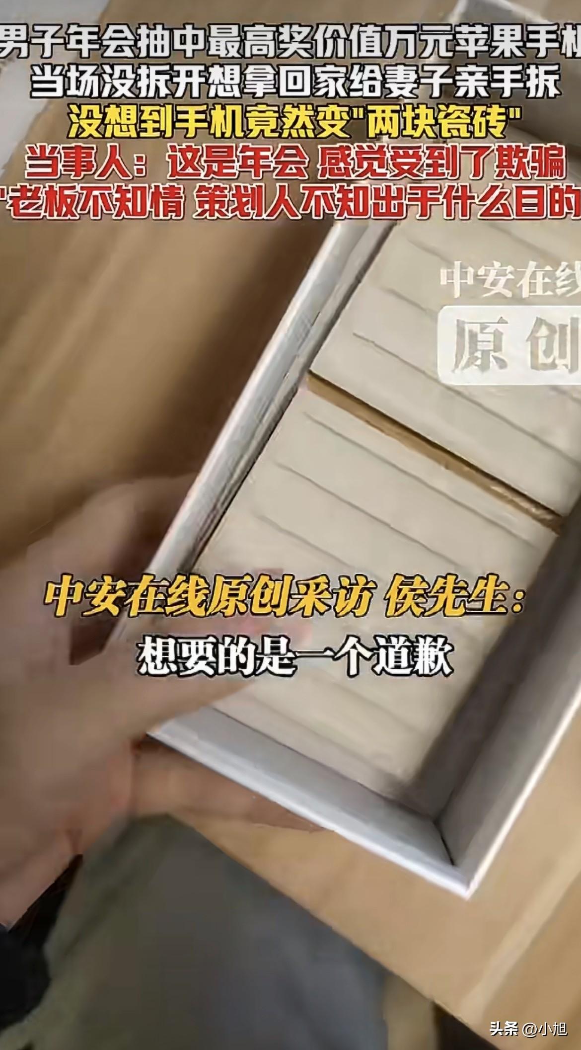 广东一兄弟,在公司年会上手气爆棚,抽中了那个最让人眼红的特等奖——一部价值万元的苹果手机。台下同事羡慕的欢呼声,他自己脸上藏不住的笑,那感觉,就像一年到头的辛苦都在这一刻值了。 他没在现场拆封。心里揣着个挺暖的想法:把这份大惊喜带回家,让媳妇亲手打开。能想象他路上那份心情,轻飘飘的,觉得日子真有奔头。 结果,啪嗒一声,包装盒在家里打开了。没有手机,没有充电线,只有两块沉甸甸、冷冰冰的瓷砖妥妥地躺在盒子里。那一刻,所有的开心都碎了一地,剩下的只有懵,还有一股火直往头顶冲。这算什么?忙活一年,最后是个笑话?他感觉受到了深深的欺骗。 这事后来有说法了。公司老板据说并不知情,而那个想出这主意的策划人露面承认了,说这就是他安排的一个“整蛊”,本意不是为了针对谁,就想搞搞气氛,让大家乐一乐。 但这话,听着真不是滋味。年会抽奖,图的是个彩头,是公司对大伙辛苦一年的一点实在回馈。把它变成一场恶作剧,性质就全变了。乐呵是建立在大家的信任和期待上的,这么一搞,信任就像那盒子一样,空了。 更关键的是那份心意被糟蹋了。这位兄弟想和妻子分享喜悦的那份朴实心思,在两张瓷砖面前,显得特别尴尬和受伤。他要的其实不多,现在也说手机可以不要,但策划人必须为这场“空欢喜”正式道歉。道歉赔的不是手机,是那份被戏弄了的尊重和期待。 说到底,年会的味道不该是这样。大家累了一年,聚在一起是想感受点温暖和诚意,而不是成了别人剧本里博取笑声的“道具”。这事一出,明年年会再抽奖,大家拿起奖品盒时,心里会不会先咯噔一下? 如果是你,兴高采烈抱回个大奖,拆开却是两块砖头,你会是什么心情?你觉得这种“活跃气氛”的方式,能接受吗?