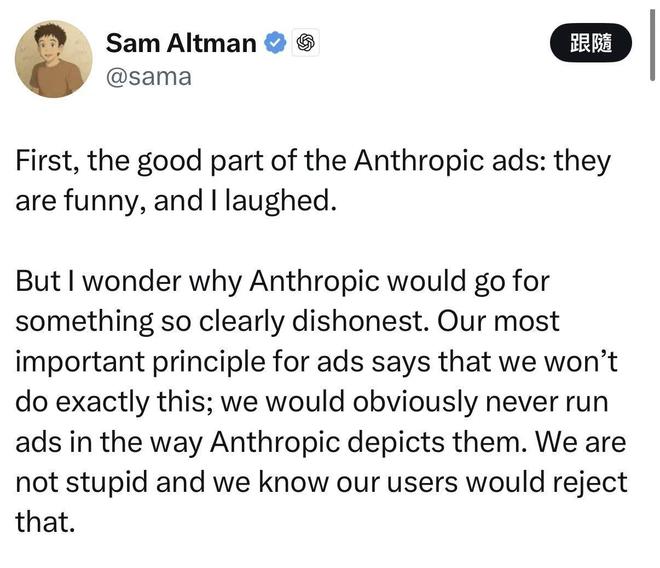 广告播出后,OpenAI执行总裁SamAltman在社交平台X发文怒斥Anthropic「很好笑」、「误导观众」。毕竟在几乎同一时间里,SamAltman对外承认了OpenAI组建一支专业的广告投放团队,并已经确认首批在ChatGPT投放广告的客户。