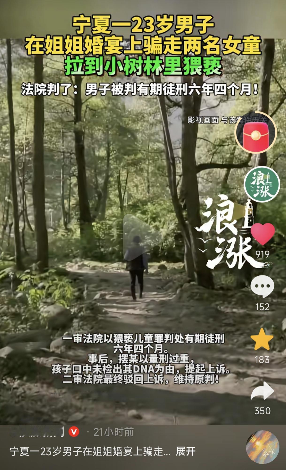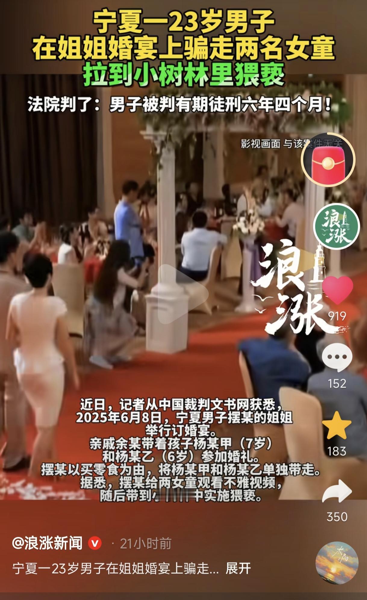 “太恶劣了!” 宁夏23岁男子在姐姐订婚宴上,以“买零食”为诱饵骗走亲戚家7岁、6岁两名女童,拉到小树林里猥亵。事后女孩母亲发现孩子不断吐口水行为异常果断报警,男子一审被判刑6年4个月,他竟然不服厚颜无耻提起上诉,最终被法院驳回维持原判,男子终是罪有应得!网友:真是禽兽不如啊,连亲戚的小孩都不放过。 (来源:浪涨新闻等) 2025年6月8日,宁夏石嘴山市一位摆姓女子订婚,双方都来了不少亲朋好友,场面十分热闹,可谁知道如此充满喜庆的氛围里竟然蕴藏着一场卑劣的行径。 女子23岁的弟弟摆某也出席了姐姐的订婚宴,而一来他就发现亲戚余某家的两个小女孩长得漂亮又活泼,十分惹人喜爱,心里顿时就萌生了一个邪恶的念头。 之后摆某开始接近两名小女孩,母亲心想大家都是亲戚对方还是女方弟弟也就没放在心上,任由7岁大女儿与6岁小女儿与他玩耍,而正是这一疏忽导致了悲剧发生。 上午11点左右,摆某见时机成熟,两女孩对他也产生了信任感与亲近感,就以给她们“买零食吃”为由单独且顺利地将她们带离了婚宴现场,丝毫没引起旁人的察觉。 不得不说,母亲还是太粗心了没有看好孩子,哪怕是亲戚也要多留一个心眼啊,估计她也没料到对方竟然如此丧尽天良吧。 之后摆某驾驶电动车将两女童带到当地一所中学门前的凉亭里,给她们看不雅污秽视频达1个多小时,两孩子还是幼童啊,摆某这是完全违背了公序良俗,极为恶劣! 看完视频后,噩梦还没结束,摆某又将她们带进某派出所旁边的小树林里。不得不说,这胆子真大啊,竟敢在派出所边上干卑劣行径,太不把法律放在眼里了。 之后摆某将小一点的童支开,然后强行猥亵了大女童,细节这里没法描述。得逞之后,摆某又恶狠狠地威胁小女孩不要把事情说出去,然后才带着二人回到宴席上。 而就在席间,小女孩实在没办法吃下饭,不仅频繁吐口水,还觉得有点恶心,这十分反常的一幕立即引起了母亲的注意。 在母亲的耐心询问下,小女孩这才怯生生地说出了被摆某猥亵的全部过程,母亲听后,愤怒不已,当即在婚宴现场就扑向摆某并厮打他,然后果断报警。 之后法院查明了全部事实,以猥亵儿童罪判处摆某6年四个月刑期。不料摆某却认为量刑过重,以未在孩子口腔发现DNA为由狡辩并提起上诉,但二审依旧维持原判。 根据《刑法》第237条规定,猥亵儿童情节恶劣处5年以上有期徒刑。本案应该算情节恶劣了,摆某胆大到令人咋舌,熟人作案、婚宴场合、派出所旁......,真是太漠视法律,太不可思议了,又明知对方是Y女却播放Y秽视频之后又强行猥亵,主观恶性实在太大了,用丧心病狂形容也不为过。 而关于DNA一事,也可以这么解释,由于小女孩陈述清楚,细节也吻合,也不存在诱供诬告,是值得采信的,不必DNA。摆某被抓后还多次拒不认罪,只是到了后期才交代了事实,证据链也完整了。 不得不说,摆某的行为太恶劣了,在姐姐订婚宴上,在亲戚聚会场合下,竟对亲戚的Y女下此卑劣毒手,还利用“信任”与“零食”相诱骗,真是丧尽天良。犯案后还威胁小女孩保密,证据确凿后还百般抵赖,毫无悔改之心,真是太过厚颜无耻又泯灭人性了,理当被重判! 最可怜的还是那名受害的小女孩,她才年仅7岁啊,这样的伤害于她怕是终身都挥之不去的阴影。 此案例也给所有家长们以深刻的警醒:带孩子参加人多杂乱的宴席时,一定不要让孩子离开自己的视线,即便是相熟的亲戚也不能让对方单独带走孩子,平时更要时刻交代孩子不要看奇怪的视频,不要去偏僻的地方,更不要让人触碰隐私部位等,若遇到被侵害要第一时间告诉家长或者报警,等等。 同时也警告那些心有不轨之人:天网恢恢,疏而不漏,千万不要漠视法律,更不要试图践踏法律的尊严,否则终将受到法律的严惩,害人害己,得不偿失!