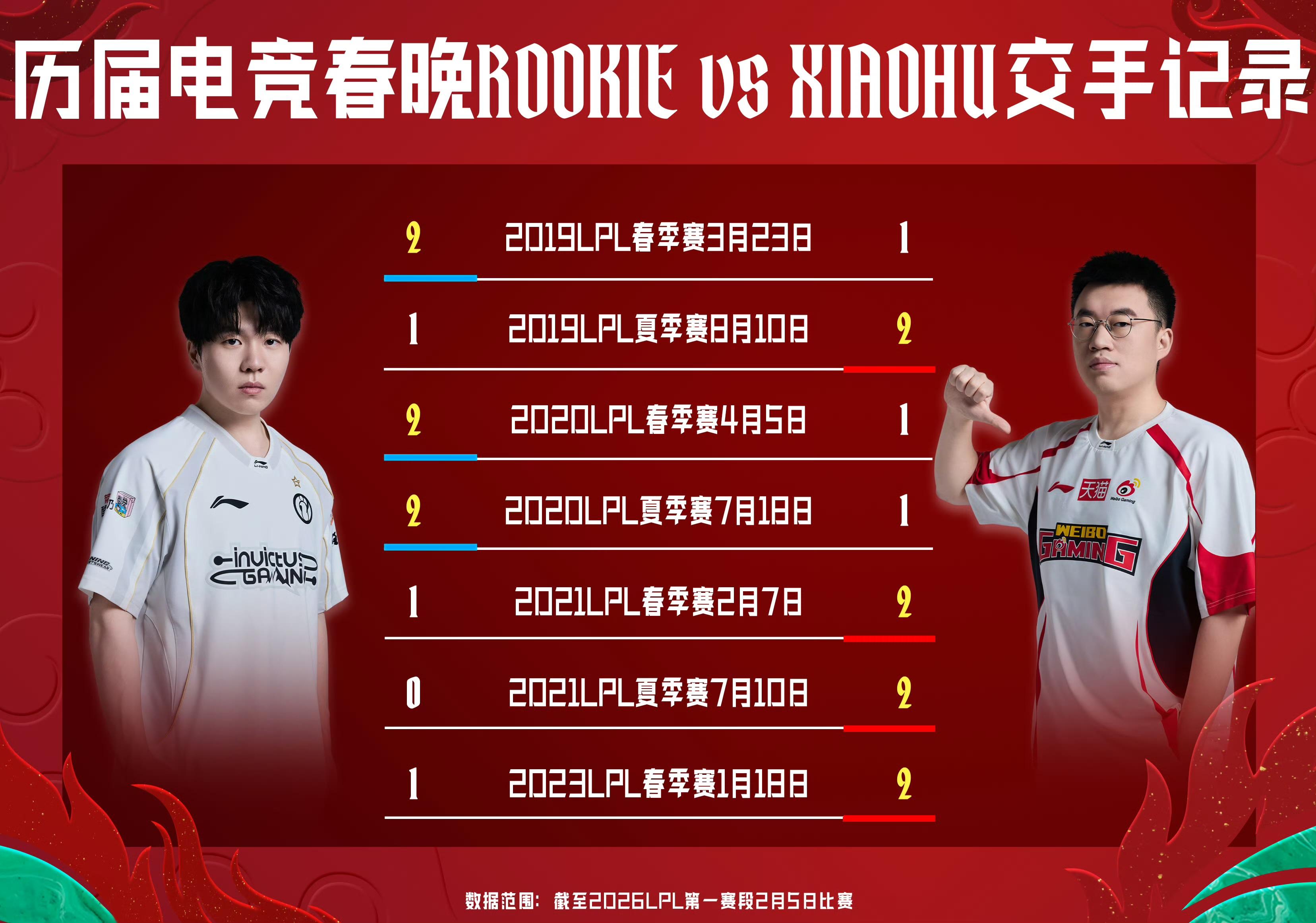 历年电竞春晚Rookie对战Xiaohu战绩如下。