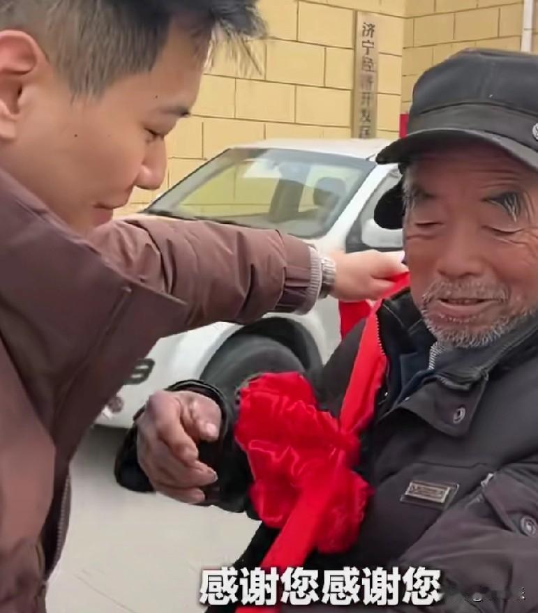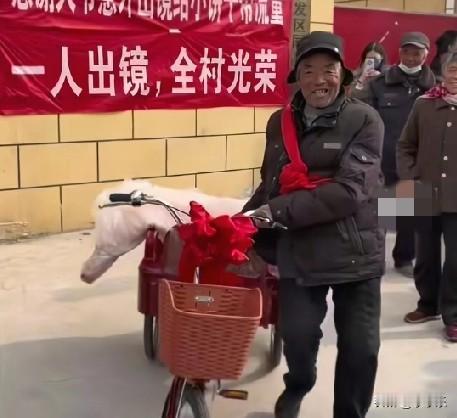近日,山东济宁,伟龙食品有限公司门前一群年轻帅小伙正在热舞宣传他们的饼干,这时一大爷蹬着三轮车意外出镜,居然带火了饼干的宣传视频,公司带着半扇猪肉来“报恩”,又给大爷戴大红花,又送给大爷一辆新三轮,瞧把这大爷乐的。 以后大爷有没有事,都要骑上三轮车去转一圈,看看他们还拍宣传视频不,[捂脸]哈哈!这大爷绝对没想到,他凭一已之力带活一个企业,意外永远藏着惊喜!这公司能兑现承诺,比做广告宣传强,这就是诚信的力量!