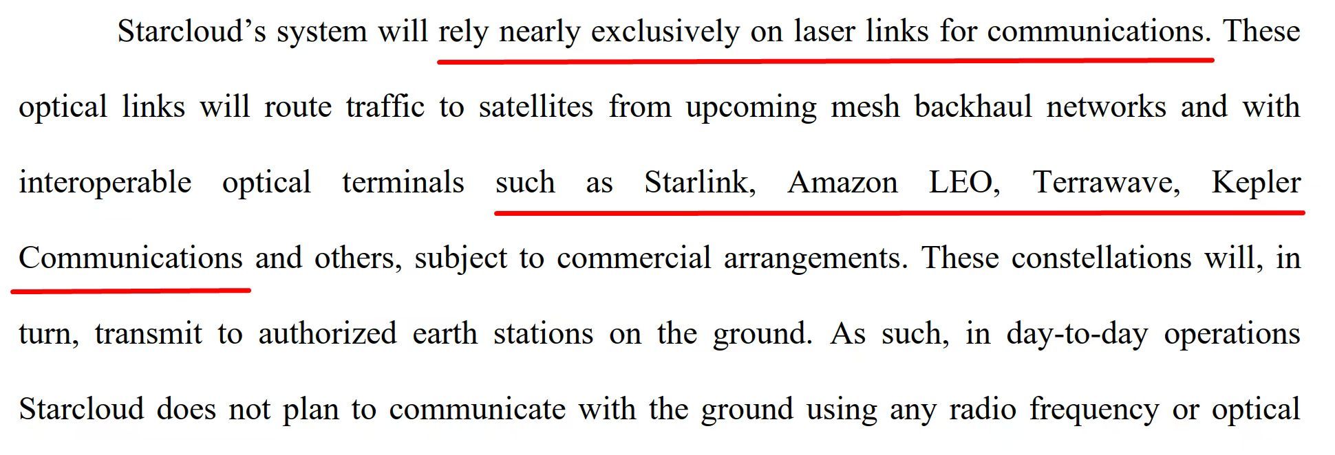 有意思的是,这次申报的Star Cloud卫星本身不具备对地高速数传链路,星地数传通过Starlink、Amazon Leo和TeraWave的核心网下传(星间激光,星地QVWE微波或者激光)