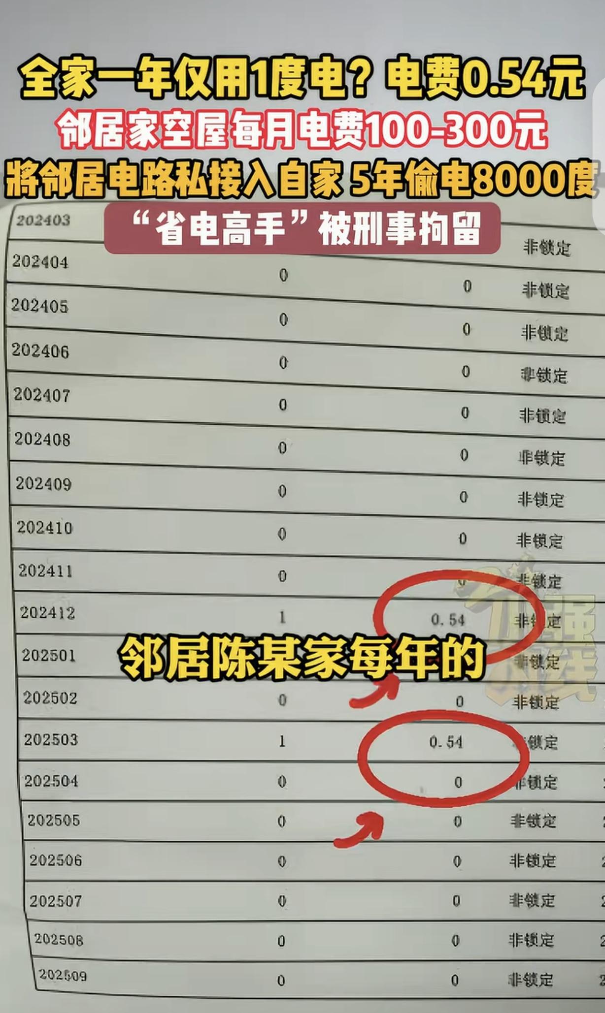 “兔子吃窝边草啦?”浙江温州,一男子看邻居常年不在家住,竟然在墙上抠了个洞,偷邻居家的电,他一年只用1度电,花0.54元,5年偷电8000度,一共4000多元,而邻居就惨了,每月家里不住人,竟然要缴100-300元电费,邻居发现不对劲,搬开客厅的柜子,她彻底傻眼了。 在浙江温州乐清,最近爆出来个特离谱的事,有个男子陈某,为了省那点电费,居然偷偷摸摸用了邻居家整整5年的电,这人自己家一年电费才交了五毛四分钱,而邻居家那个常年没人住的老房子,每个月居然得交一两百甚至三百块的电费。 这事最后还是警察叔叔火眼金睛,瞅着这电费单子不对劲,顺藤摸瓜才把这藏在墙里的猫腻给揪了出来。 这事还得从今年1月下旬说起,那天,家住乐清的何女士急赤白脸地跑到派出所报警,她说自己在农村有个老宅子,平时基本没人住,顶多过年过节回去待两天。 可怪就怪在,这房子没人住,电费单子却是月月来,而且数额还不小,每个月都得一百到三百块,何女士越想越不对劲,心说这房子难道闹鬼了?肯定有人偷电! 警察一听这事,立马跟着何女士去现场看个究竟,这老宅子是那种联排的自建房,跟隔壁陈某家就隔着一堵墙。 巧的是,这两家的电线正好都埋在这面共用墙里,这就给那些心术不正的人留了可乘之机,警察为了搞清楚状况,先把这两家这几年的电费单子都调了出来。 这一看不要紧,警察都乐了:何女士家没人住却电费高得离谱,而隔壁陈某家有人住,这两年每年的总用电量居然只有1度!按当地五毛四一度电算,他家一年才花五毛四的电费。 警察心里跟明镜似的,这简直就是把“我偷电”三个字写脸上了,你想啊,就算是个空房子,电表自己走走字,插座上插个啥东西待机,一年也不止1度电吧?更何况陈某一家子大活人天天在里面吃喝拉撒,晚上开灯、做饭烧水,哪样不得用电?这1度电过一年的“神话”,说出去鬼都不信,再结合何女士家那莫名其妙的高电费,警察断定,这陈某肯定有问题。 1月21号晚上,警察带着证据直接杀到了陈某家,进了门,警察直奔客厅墙角那个不起眼的旧柜子,柜子一挪开,好家伙,墙上赫然出现一个碗口大的洞!洞里面乱七八糟的电线被人剥了皮,好几股线头拧在一起,一看就是从何女士家的线路上私接到了陈某家。 面对这铁证如山,陈某也知道没法抵赖了,耷拉着脑袋全招了,他说早在2021年,他就发现隔壁何女士常年不回来,房子一直空着。 他这人贪小便宜,心想反正也没人住,不如借点电用用,省点开销,于是他就趁着没人注意,在两家共用的墙上凿了个洞,偷偷把电线接了过来,这一接就是5年,他自己觉得挺聪明,手段挺隐蔽,没想到最后还是栽在了那不正常的电费单上。 警察算了一笔账,这5年里,陈某一共偷了何女士家大概8000度电,折合成钱得有4000多块,这些钱全让不知情的何女士给当了冤大头。 而且这事,还不光是钱的问题,陈某那私接电线的手法极其业余,线头都裸露在外面,很容易短路或者起火,这要是真着了火,不光他自己家遭殃,还得连累周围邻居,想想都后怕。 现在陈某因为涉嫌盗窃罪,已经被乐清警方给刑事拘留了,这案子还在进一步审理中,可能有人觉得偷点电不算啥大事,顶多就是罚点钱,其实不然,根据《电力法》和《刑法》的规定,盗窃电能也是犯罪,数额较大的还得判刑,陈某偷了4000多块钱的电,早就够上了“数额较大”的标准。 这事也给大伙提了个醒,电这东西虽说看不见摸不着,但也是受法律保护的商品,不是谁想拿就能拿的。 咱平时不管自己住不住的房子,都得留心一下电费单子,要是发现电费突然多了很多,千万别大意,赶紧找供电局或者报警查查。 至于那些想偷电占便宜的人,也趁早收手吧,别为了省那点电费,最后把自己送进局子里,那可就真是捡了芝麻丢了西瓜,亏大发了。 对此你怎么看? 信源:齐鲁晚报·果然视频