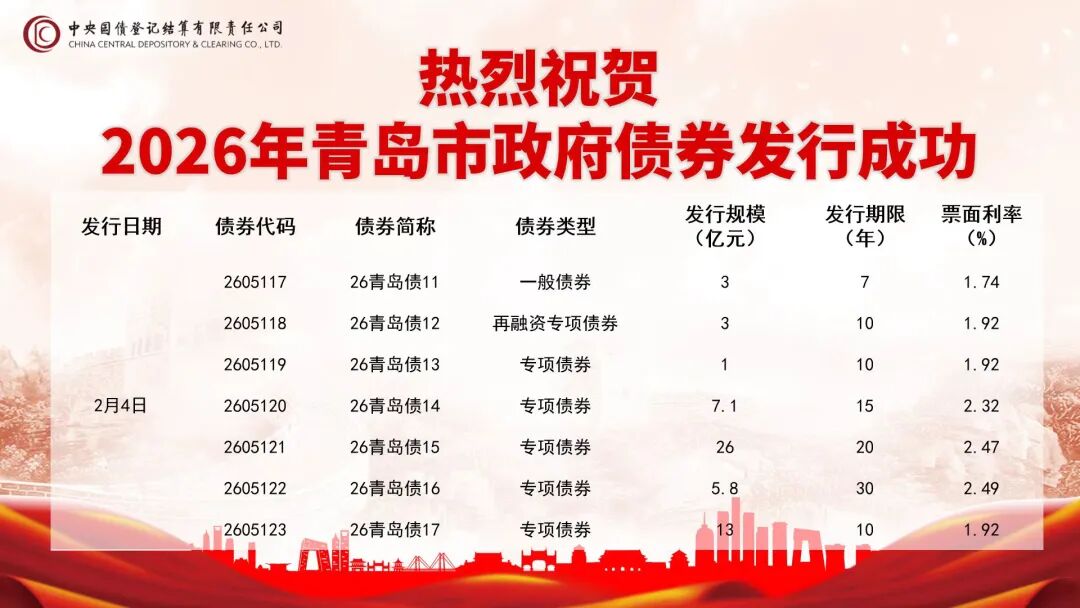 青岛日报社/观海新闻2月6日讯观海新闻记者自市财政局获悉,2月4日下午,青岛在中央结算公司发行2026年第三批地方政府债券58.9亿元。