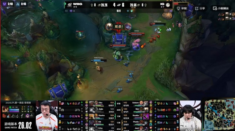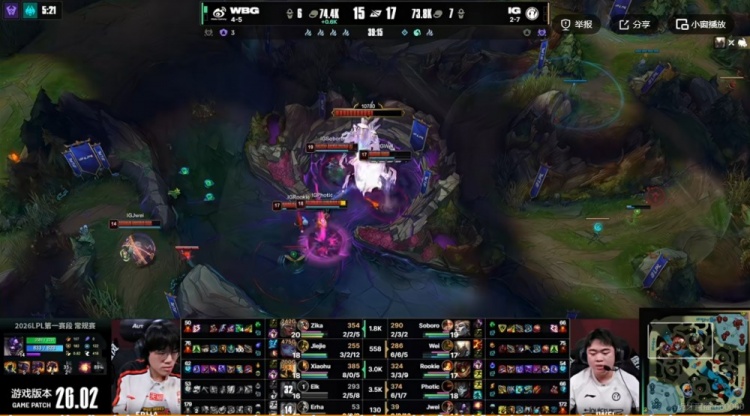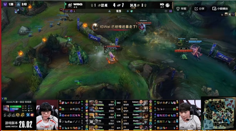 [32:03]Wei潘森在中路又被强开击杀!WBG抓住复活的时间差拿下大龙!Jiejie波比大招锤走Jwei牛头!iG也没办法留人了!随后WBG拿下第六条小龙!iG还是想来看结果Wei潘森被留住,WBG还可以拆掉iG中二塔+上二塔,经济反而反超了啊!