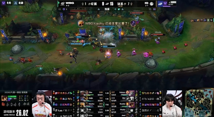 [22:30]iG拿下听牌龙!但是河道Wei潘森白给,Xiaohu沙皇拿下终结赏金!WBG抱团开大龙,Erha芮尔绕后没开好,但是绕后的Soboro亚恒也被拉扯击杀!双方1换1!拉开!