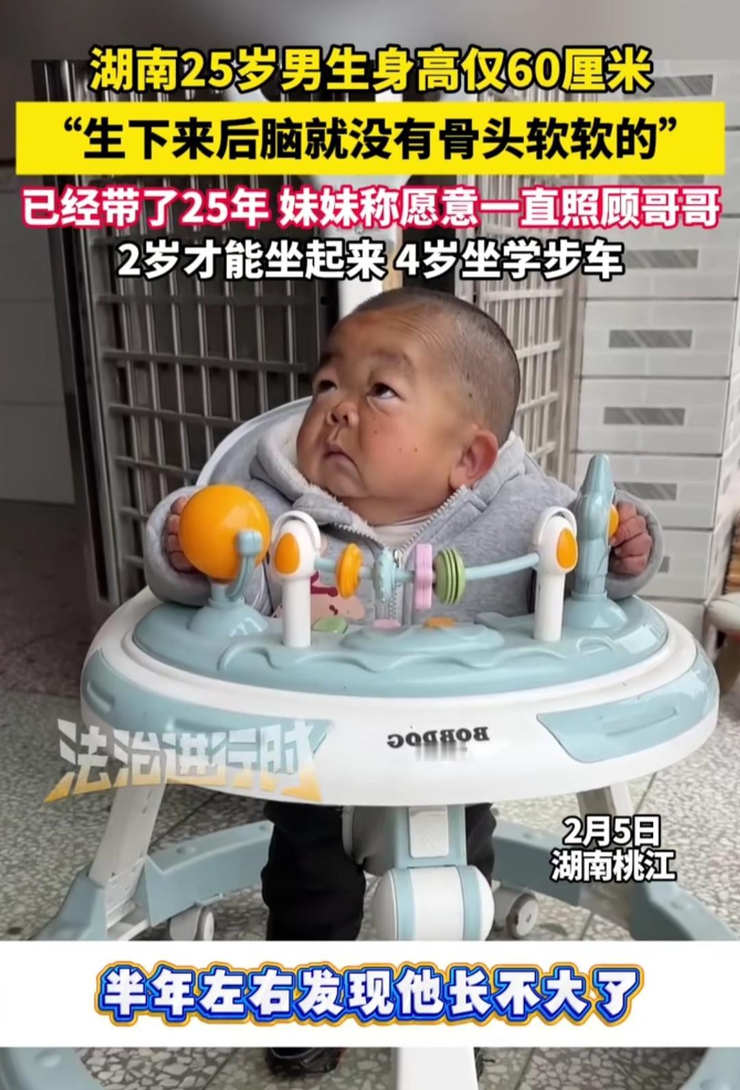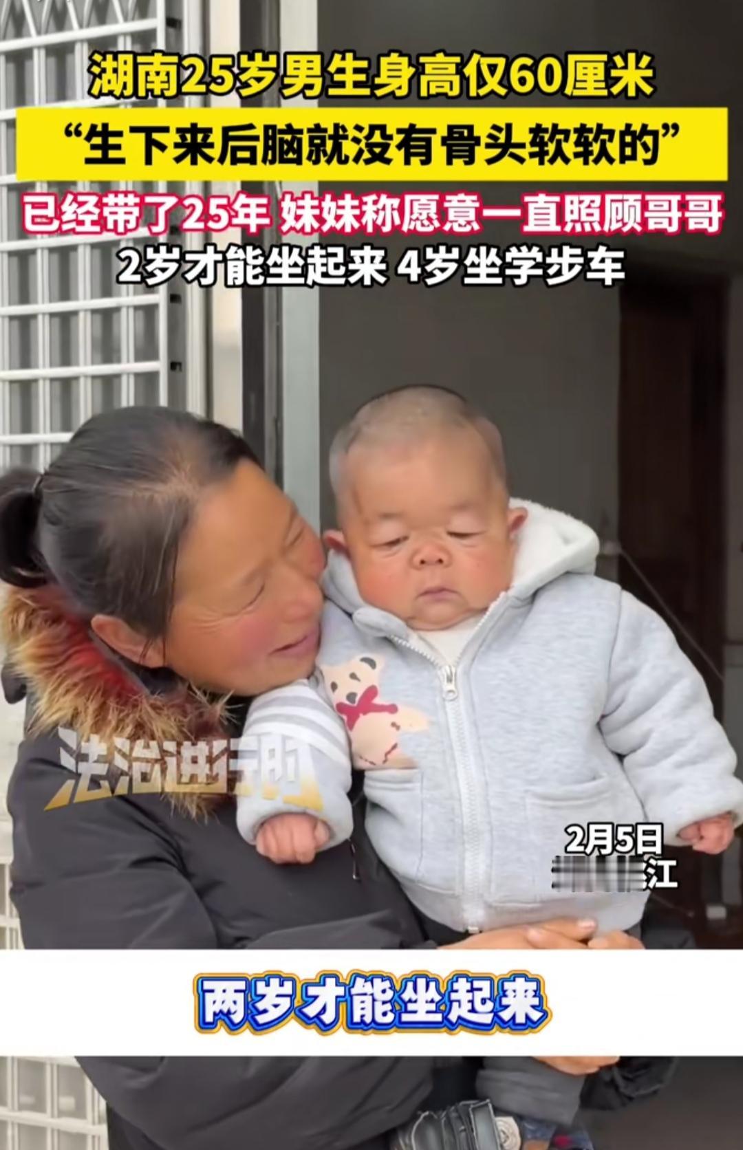 谁能想到,25岁的年纪,身高却只有60厘米?湖南益阳男生小军,打小就和别人不一样——天生缺乏生长激素,还伴着先天性心脏病,智力停留在幼儿阶段,2岁才勉强坐起,4岁靠学步车才敢挪动半步。 旁人眼里的“特殊”,在20岁妹妹心里却是最放不下的牵挂。从小看着哥哥一点点努力适应生活,她没喊过苦没叫过累,如今工作后更是直言“愿意照顾哥哥一辈子”,把陪伴变成了日常里的本能。 没有轰轰烈烈的誓言,只有最朴素的守护。60厘米的身高,隔不开兄妹间的血脉羁绊;先天的缺憾,挡不住亲情的温暖流淌。生活给了他们别样的考验,却也让这份双向奔赴的爱,变得格外动人。 有人说命运不公,有人赞亲情可贵。而这对兄妹的日常,不过是用陪伴回答生活的刁难。愿这份纯粹的守护被时光温柔以待,也愿每个不完美的人生,都能被这样坚定的爱包裹。