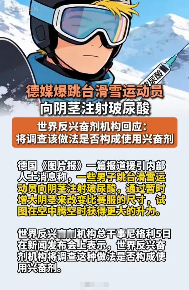 德国“图片报”爆料滑雪运动员向丁丁注射玻尿酸,通过增大丁丁来改变比赛服尺寸,确保滑雪服没有冗余的材料,以此在空中腾空时获得更大升力…你要不要看看在说什么?真的为了比赛?我不信…[泪奔][泪奔][泪奔]德国滑雪肌 膝盖打玻尿酸 屁股滑雪