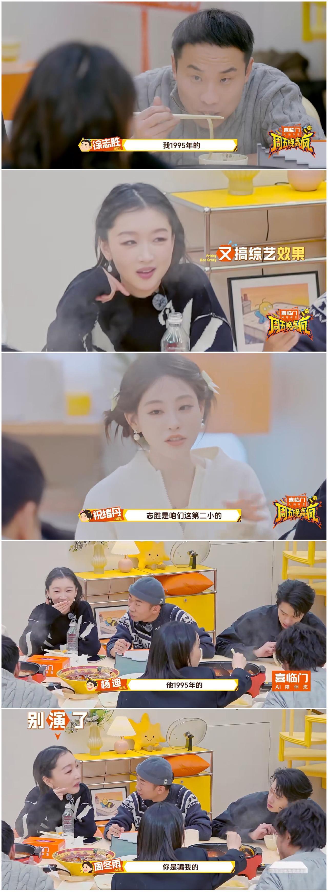 周冬雨这次躲不过去了, 当面给徐志胜道歉, 她一来就“闯祸”, 这一上来就“得罪”了祝绪丹,杨迪, 接下来都不知道还会“闯什么祸”呢。 周冬雨一听徐志胜 叫王传君为“哥”, 以为只是尊称。 以为他们是同龄人。 结果被告知徐志胜1995年, 祝绪丹,杨迪接连解释, 周冬雨都不相信, 坚称他们在说谎。 哎呀, 周冬雨是以前被背叛过吗? 那么不容易相信身边的人, 一再质疑。 就这样逼得徐志胜要 邀请爸妈和接生者一起来力证, 真是“笑不活”了。 还要去测骨龄以证清白。 周冬雨一来这顿操作, 就“得罪”了那么多人, 难怪她自称情商低, 真的是一点都不假。 对于这一点, 网友一点都不怀疑。 于是她就当面给徐志胜道歉, 开启夸夸模式, 企图蒙混过关, 徐志胜也帮着给她台阶下。 场面才不那么尴尬。