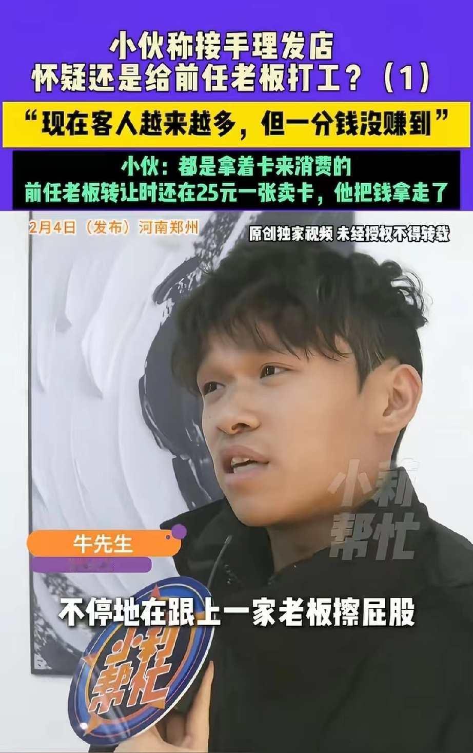 真让人哭笑不得,近日河南一男子用30000块钱租一家理发店,可万万没想到,第二天开门营业,就来了十多个人,每人手里还都拿着一张红色的卡片,上面写着25元洗剪吹两次,上面还写着上个老板的名字,男子一问才知道,这些卡是在转让之前卖出去的,甚至在转让的当天晚上还在继续售卖。 男子很郁闷!他辛辛苦苦工作没拿到一分钱,还得免费帮别人剪头, 原来以前的老板在转让之前就通知了地推停止,但卡片已经卖出去上百张,后来男子联系记者过来帮忙,前老板才同意把钱退给有卡片的人,可是这件事一时半会不是能解决了的,现在还有拿卡的客人每天都到店里来,男子的收入都替前老板还债了。 你们有没有遇到过这种接了别人摊子被坑的情况?要是换作你,是硬撑下去?还是直接关门大吉呢?
