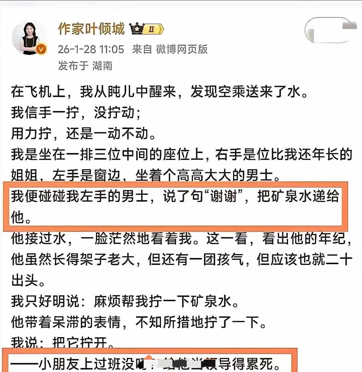 武汉女作家叶倾城发文表示:“我因为坐飞机拧不开矿泉水瓶,于是向旁边一个看起来‘长得架子老大、高高大大的一团孩子气的20岁左右的男士’碰了碰手,说了句‘谢谢’,然后把矿泉水瓶递给他,他接过水,一脸茫然地看着我,我只好说明,“麻烦帮我拧一下矿泉水”,他带着呆滞的表情,不知所措地拧了一下,没打开,我说,‘把它拧开’,我的内心活动是这样的,‘小朋友,上过班没呀?给他当领导得累死。‘”