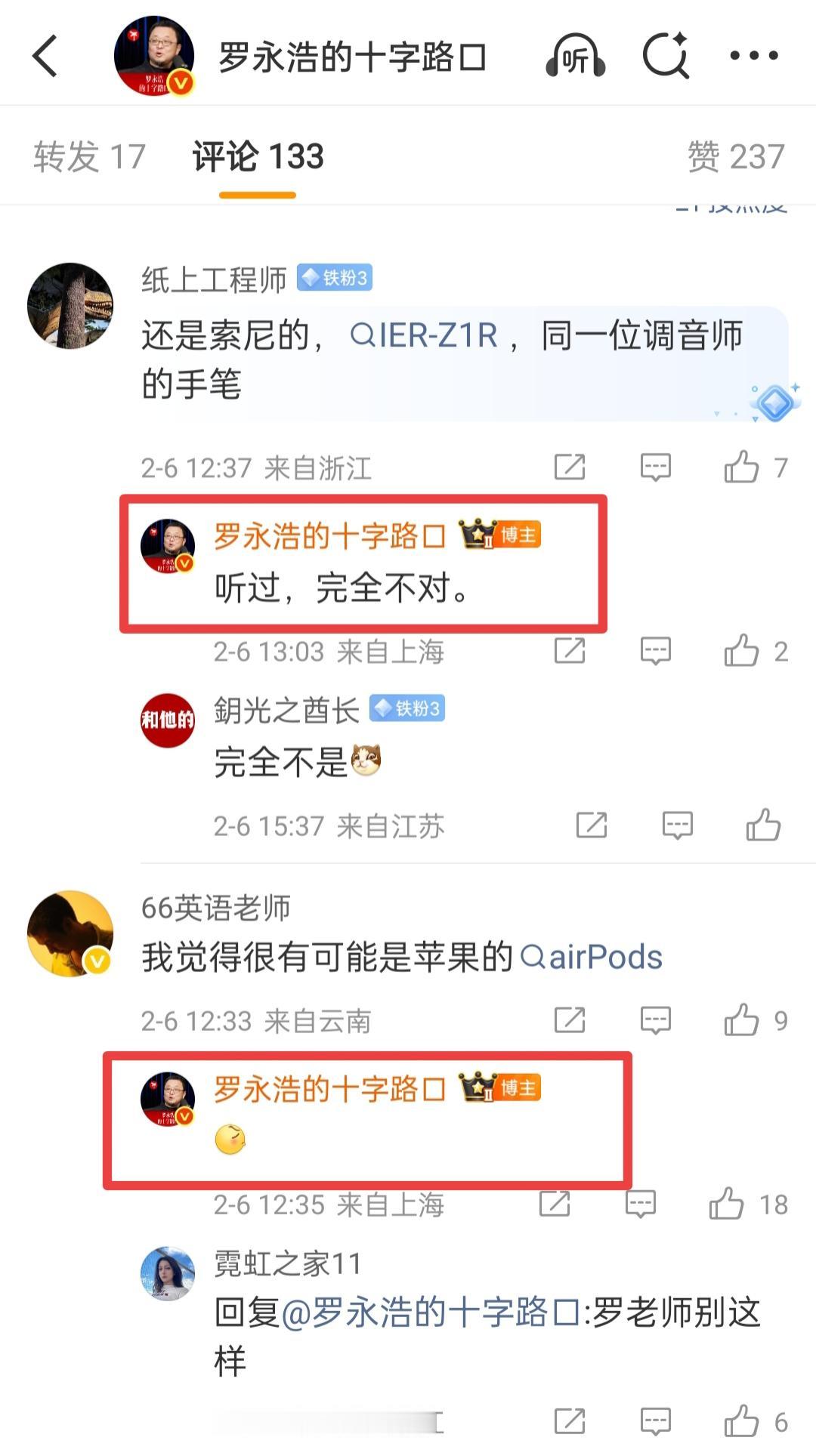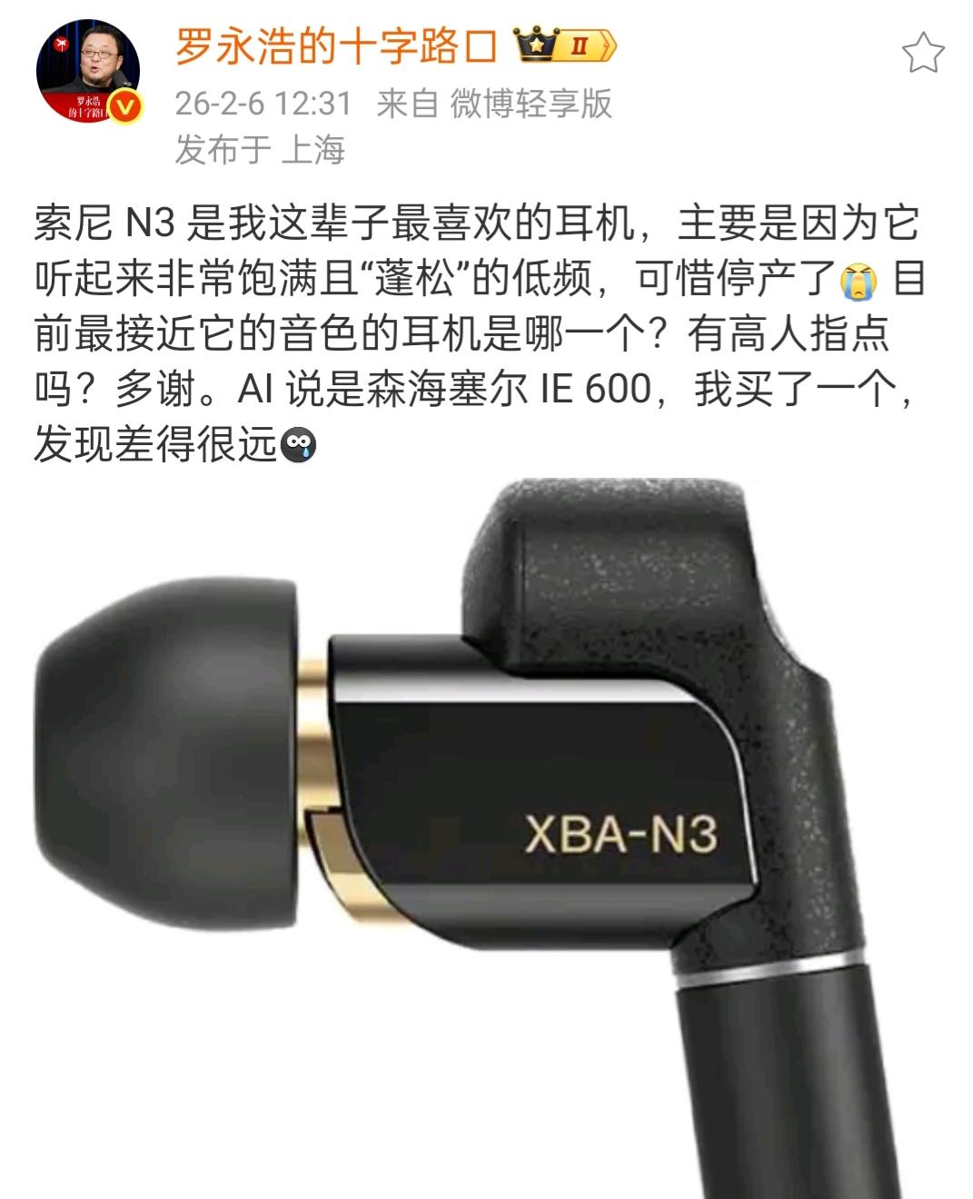 罗永浩谈喜欢的耳机停产。2月6日,罗永浩先生发文说,索尼N3这款耳机是他最喜欢的耳机。老罗总结了这款耳机有两个特点,一个是它具有“蓬松”的低频,第二是它的音色较好。 可惜这款耳机停产了,老罗想找到替代品,于是他问AI,结果AI推荐的也不行。 在评论区,有网友给他推荐索尼的新款耳机。老罗评论说,听过,完全不对。 还有网友给他推荐苹果的耳机,老罗发图案表示无奈。 看来老罗对这款耳机是有感情了,就像大家记忆中美食的老味道一样。建议老罗可以在国产耳机品牌中寻找一下,兴许能找到音质等方面相近的替代品。