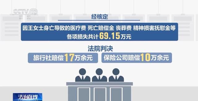 经核定,因王女士身亡导致的医疗费、死亡赔偿金、丧葬费、精神损害抚慰金等各项损失共计69.15万元。最终法院判决旅行社赔偿17万余元,保险公司赔偿10万余元。