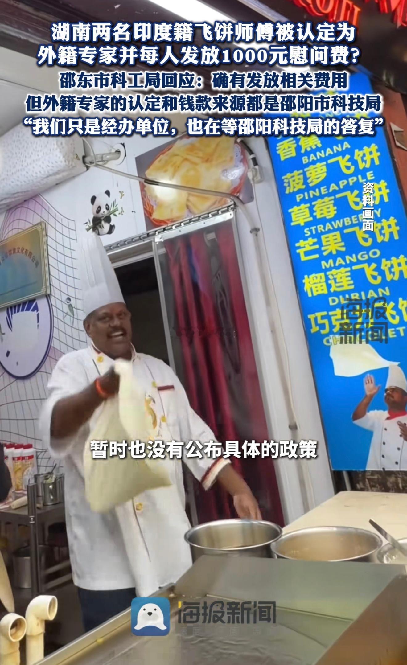 湖南两名印度籍飞饼师傅被认定为外籍专家,每人发放1000元慰问费。官方回应:确有发放相关费用。