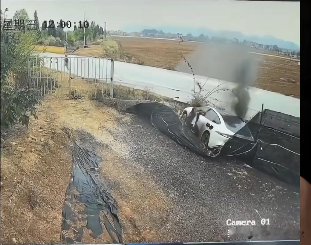 这一个某风的电车撞防护栏后不到2分钟就起火,之后在路人的帮助下砸开后车窗,救出了