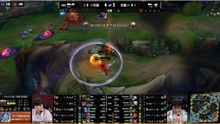 [12:09]Xun赵信越上配合Bin安蓓萨强杀Flandre雷克塞,Tarzan潘森支援赶到,但是Bin安蓓萨R命中了啊!Xun赵信反手R闪接到了控制!这波BLG上野配合打出0换2!Bin安蓓萨双杀!