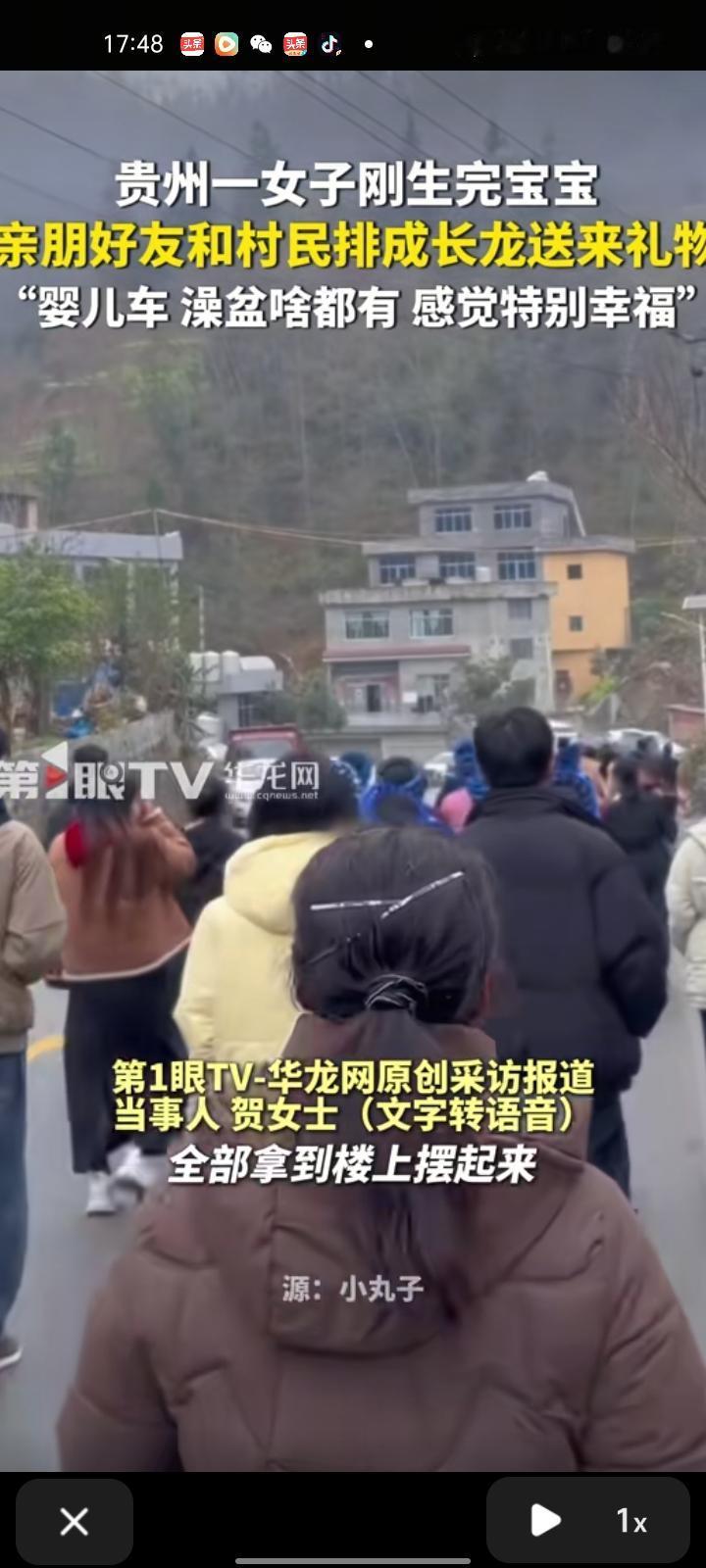 2月5日,安顺市紫云县。女子刚生完宝宝,因当地习俗要娘家人给小孩送背带,亲朋好友和村民排长龙送礼物,婴儿车、洗澡盆啥都有,不知道来了多少人。他们把东西全部拿到楼上摆,然后收着放在房间里,这一幕让女子感到特别幸福