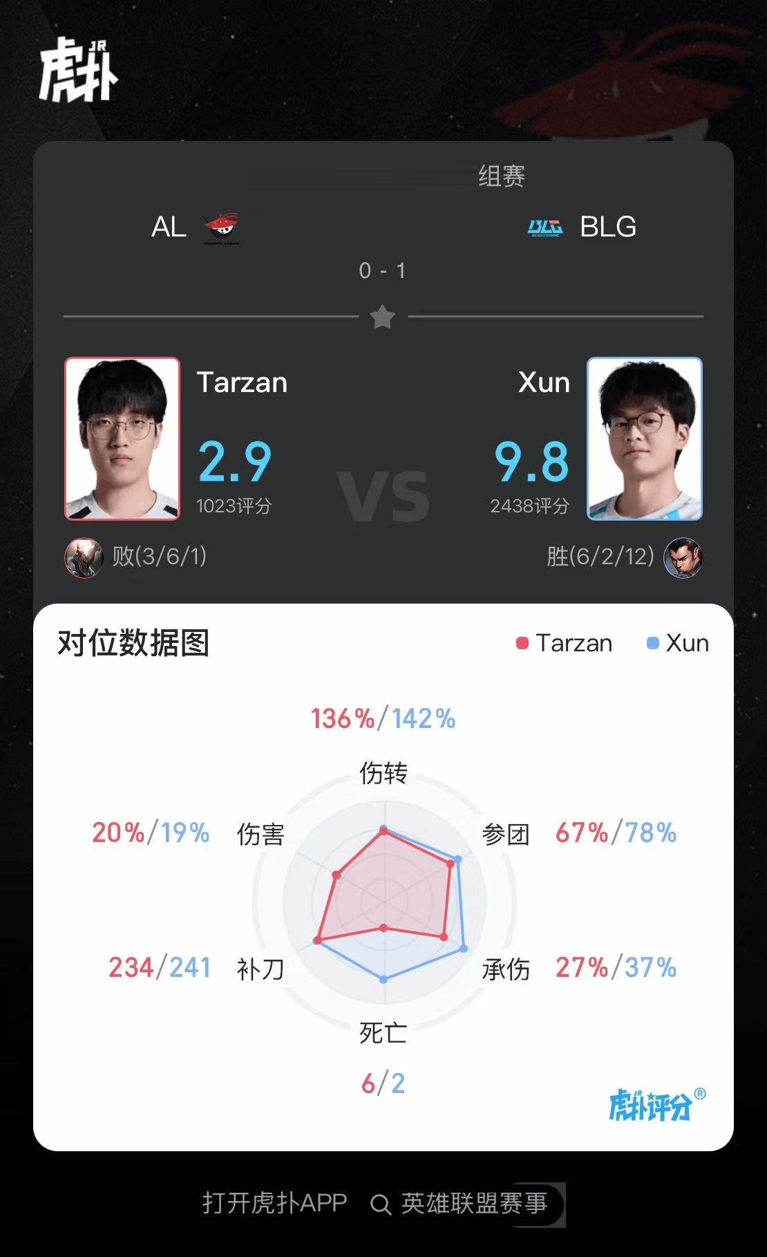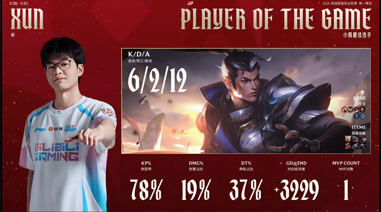 Xun赵信打出6/2/12战绩,斩获BLG对阵AL第一局MVP
