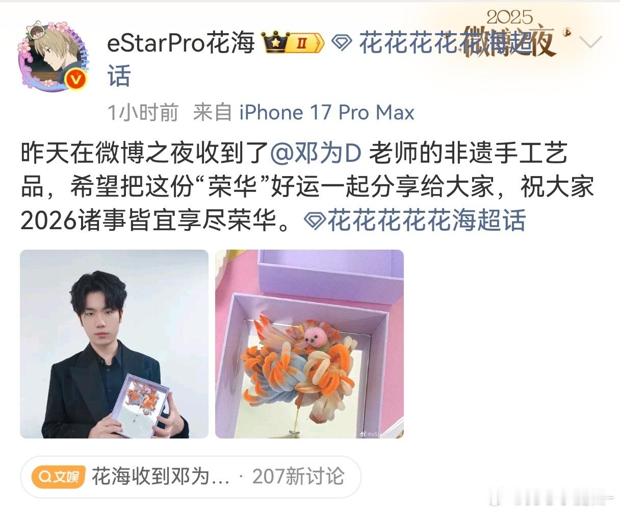 花海收到邓为的礼物 微博之夜交换礼物环节,KPL选手花海抽到邓为准备的非遗绒花胸针,礼物是紫色绒花胸针,与花海所在五人组“易坦子融花”的谐音“一坛紫绒花”完美呼应,是有点缘分在的