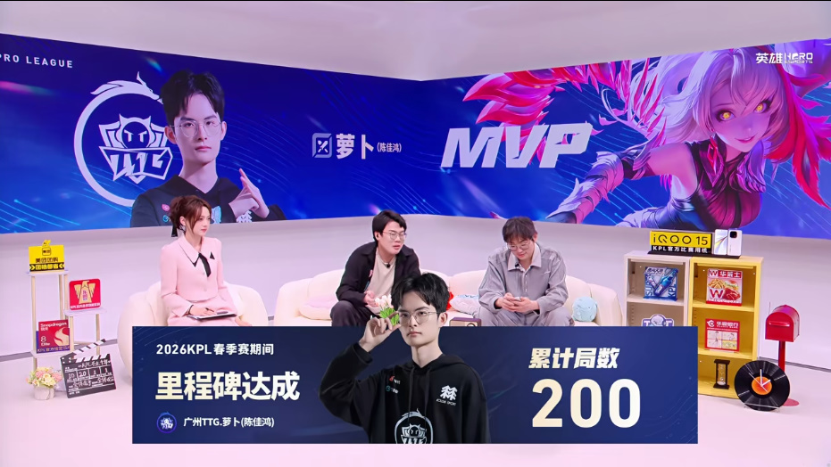 虎扑02月06日讯2026KPL春季赛,广州TTG对战桐乡情久第四局比赛中,广州TTG.萝卜达成里程碑:200累计局数