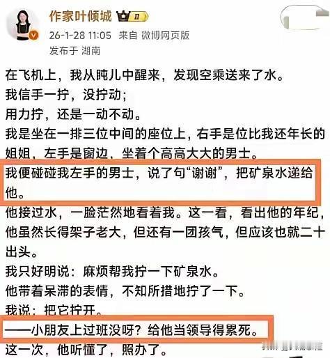 作家矿泉水事件,说到底是中年大妈并没有意识到自己老了,还以为自己是娇俏小姑娘,动动手别人就能秒懂她的意思。 这不是作家一个人的问题,而是一个比较普遍的中年现象。明明在别人眼里已经是大妈形象,却还有一颗雀跃的少女心,以为自己还是20年前的模样,并没有怎么老。 如果换成18岁少女,递上矿泉水说句谢谢,别人秒懂是需要帮忙拧开,可同样的事件放到中年大妈身上,别人闹不明白是怎么回事,因为年轻人不相信眼前五大三粗的女人,会拧不开一瓶矿泉水,如果没有那句谢谢,年轻人以为遇到了骚 扰都说不定。 可作家不这么看,她觉得自己指向已经后清楚了,年轻人不明白是没眼力见,恰恰忽视了年龄和代沟。