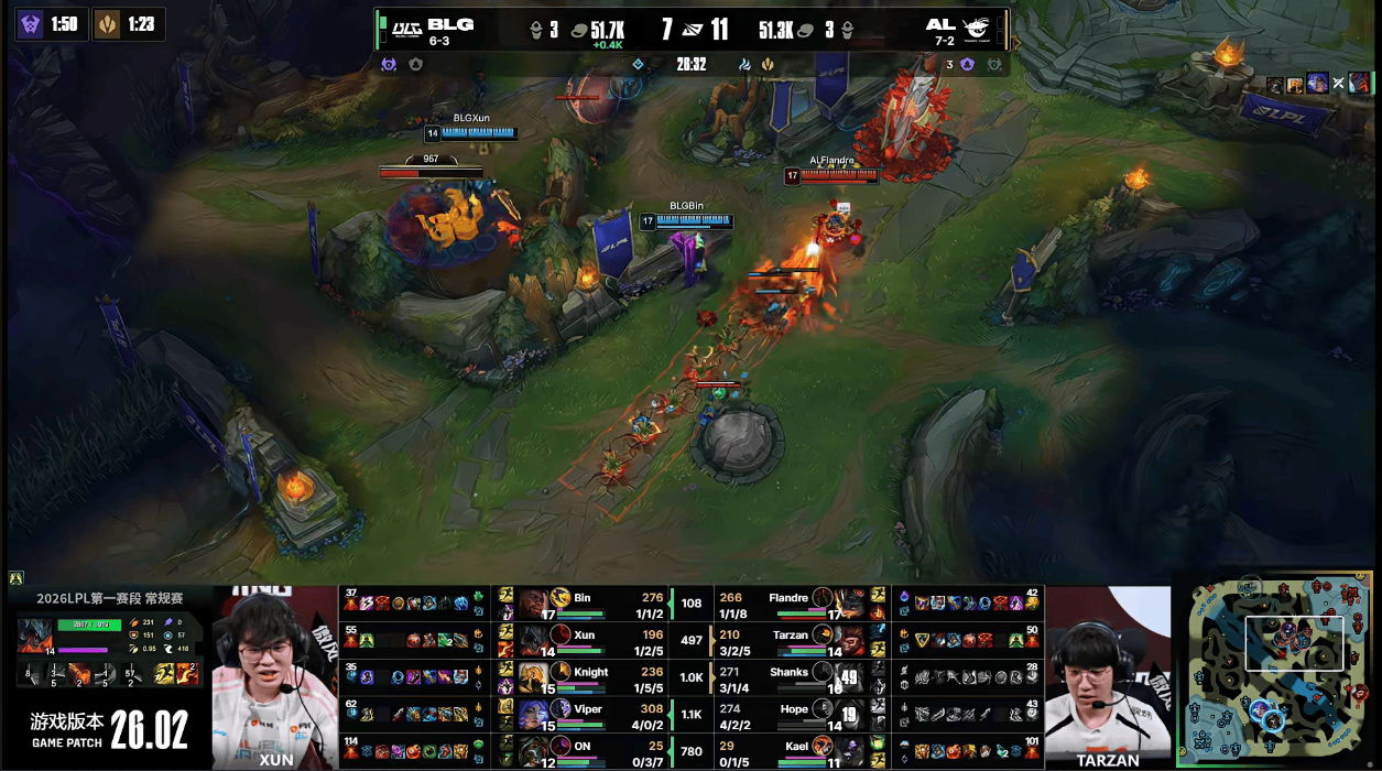 26分钟,Tarzan强开Knight失败,BLG先后击杀Hope与Shanks