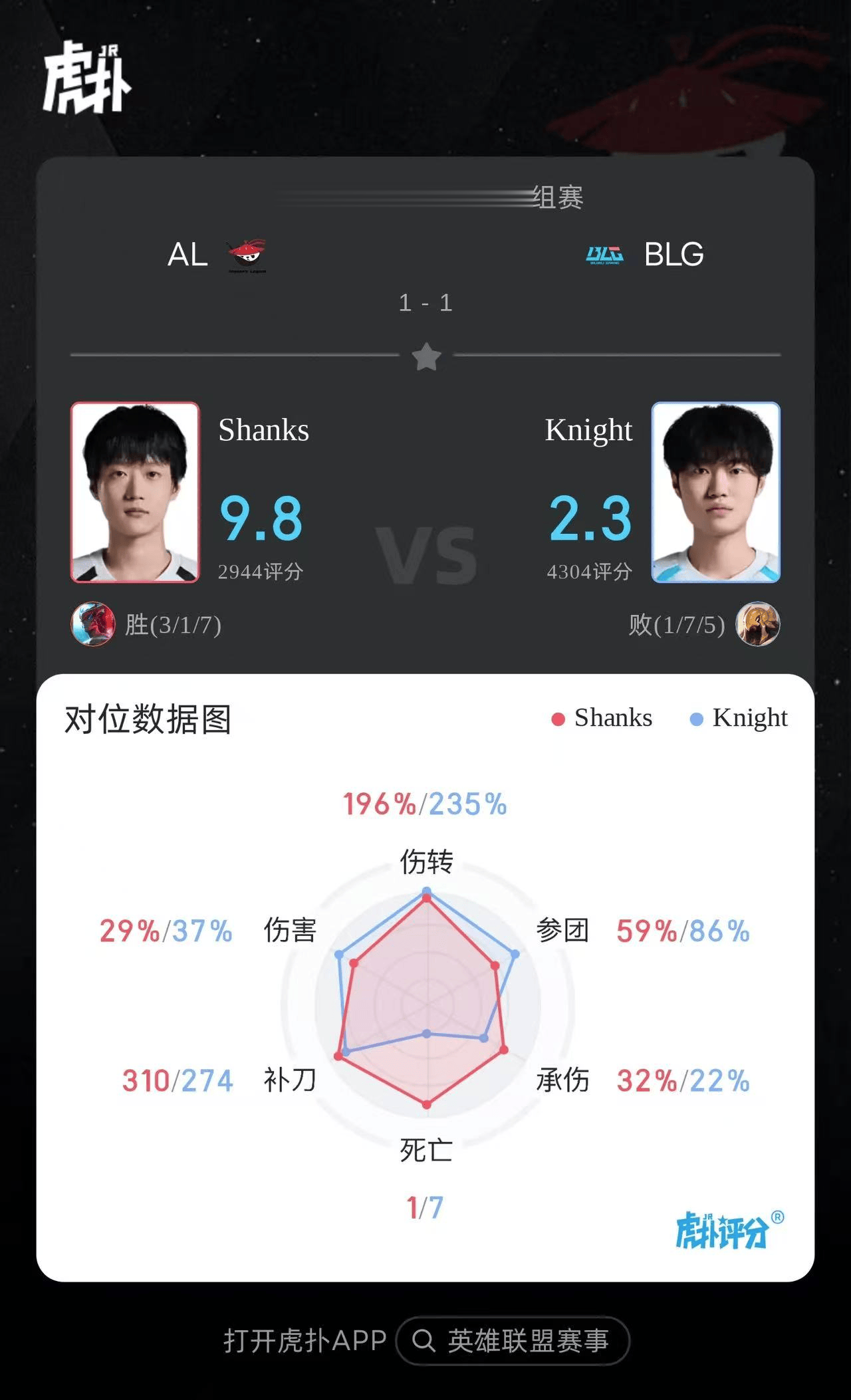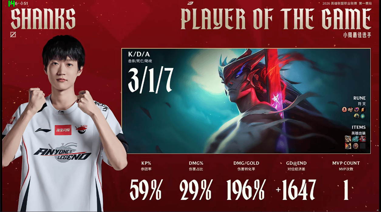 Shanks永恩打出3/1/7战绩,斩获AL对阵BLG第二局MVP