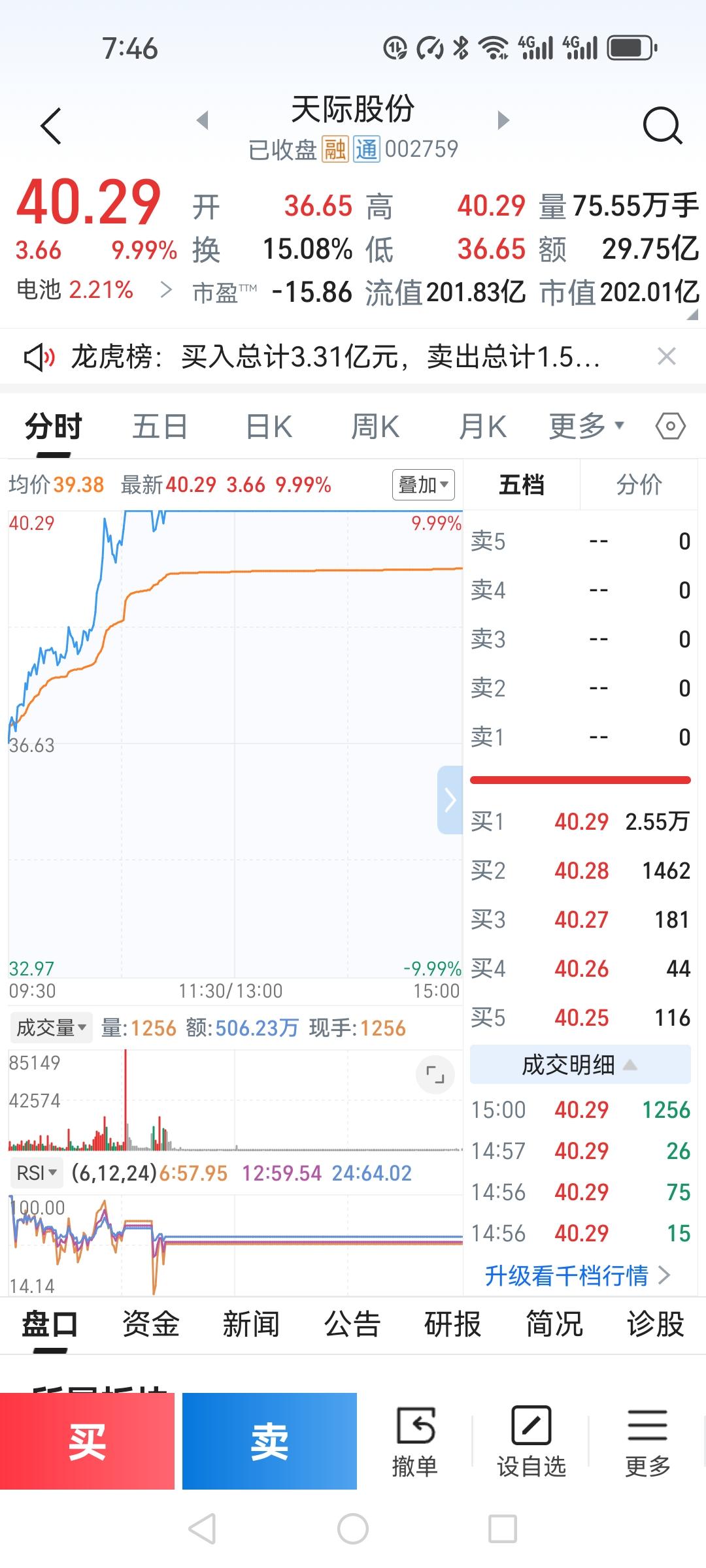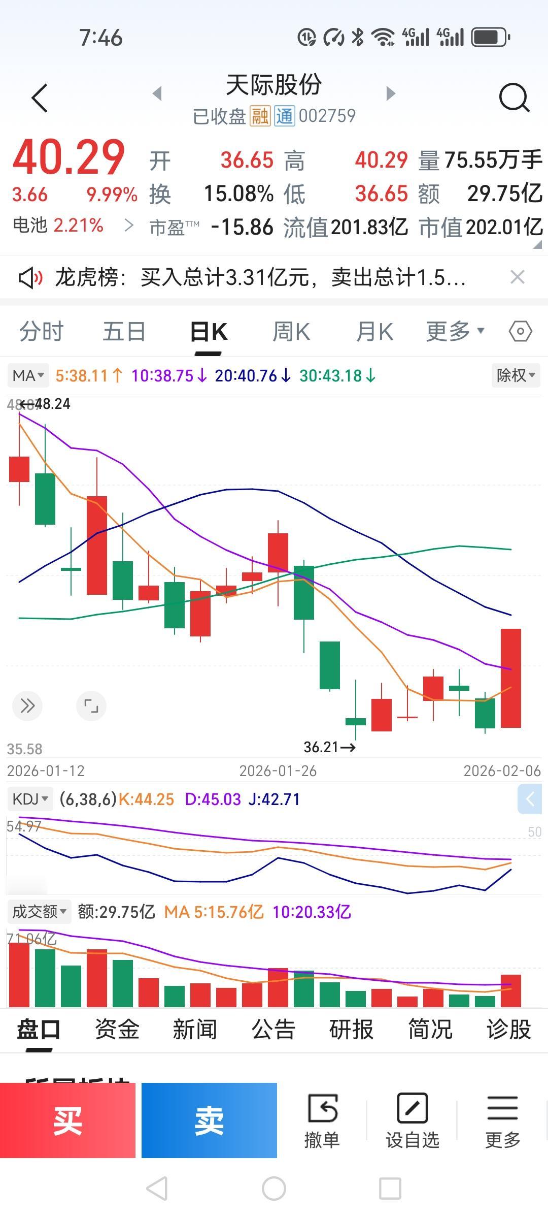 今天简直是臭大了,今天想做反T,结果T飞了,没想到涨停了。 如果今天不瞎操作,这只票我就可以盈利了,结果现在还亏八千多,天际股份开盘36.65,我在38.2卖出了1000股,再回调时我又在38元接回1000股,在十点半时强势涨停,后又打开涨停板,瞬间又死死的封上涨停,直到收盘,牢牢的封在40.29上。 昨天还是跌跌不休,今天就来了个涨停,让你都猜不透主力是在吸筹还是在出货,今天开板又封涨停,我担心是一日游,又在涨停板上卖出1000股,反而加大了成本,真恨自己没耐住寂寞,但愿明天回调再给我补仓的机会。跌的时间长了,就有点按捺不住,就容易做出错误的决定, 今天后悔的大腿都拍肿了,晚上吃饭都不香了,还在后悔中。你们看看天际股份明天会不会连板,大家共同讨论一下,股票怎么做T+0