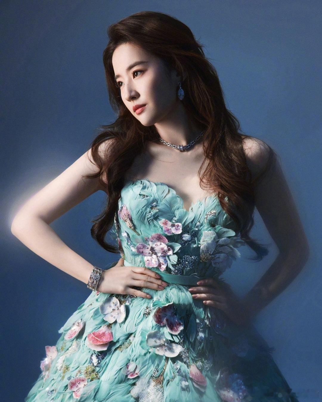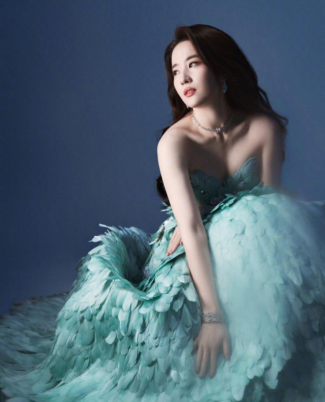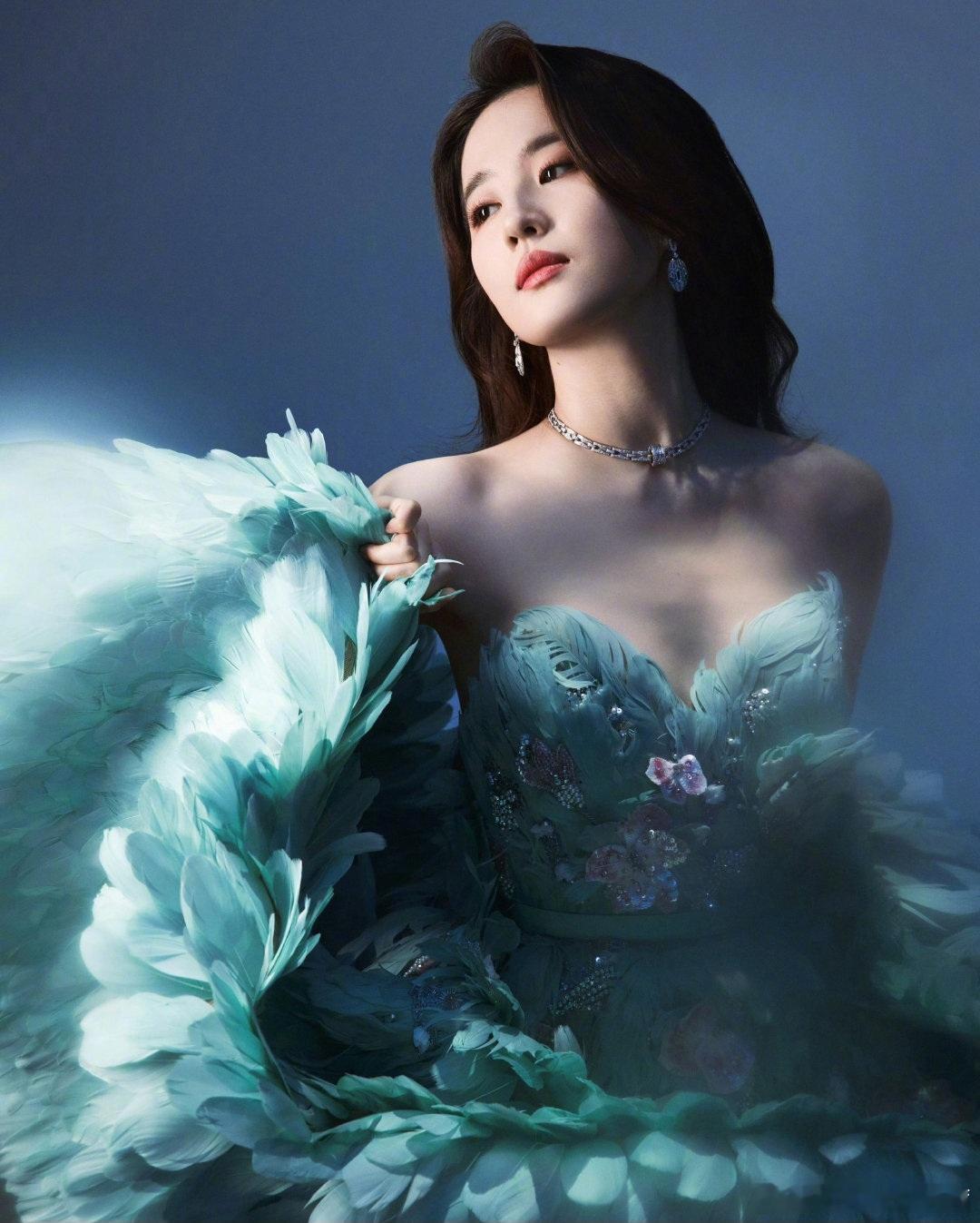 在这组照片中,刘亦菲身着一袭极具梦幻感的薄荷绿抹胸羽毛裙,裙身由层层叠叠的轻盈羽