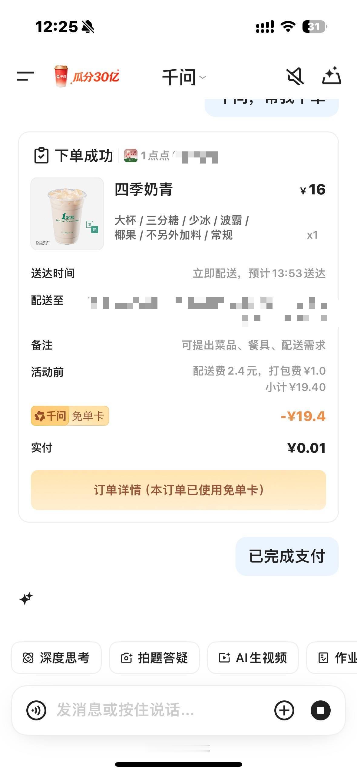 千问免单文学这周的快乐是用千问点一分钱奶茶 美滋滋开启我的甜蜜周末!还有各种朋