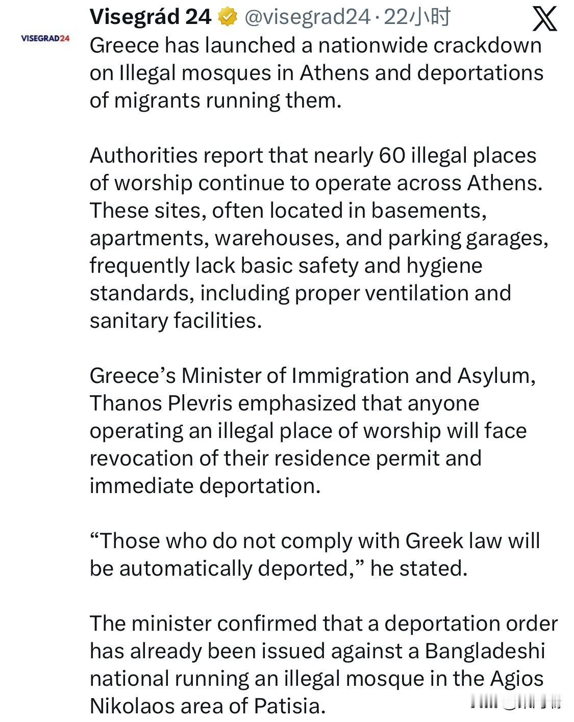 希腊政府已开始打击雅典的非法宗教场所,并驱逐经营这些场所的移民。 希腊移民和庇护部长萨诺斯·普莱夫里斯(Thanos Plevris)宣布,将在全国范围内搜查并关闭雅典市内约60个非法宗教场所。 这些场所通常位于地下室、公寓、仓库或停车场,往往缺乏基本的安全和卫生标准,例如适当的通风和卫生设施。经营非法礼拜场所不仅会受到刑事处罚(监禁两到六个月并处以罚款),其居留许可也将被撤销,并立即被驱逐出境。 一名经营非法清真寺的孟加拉国国民已被下达驱逐令,标志着新法律条款的首次应用。希腊当局强调,此举旨在执行法治并维护国家安全,同时保护合法的宗教活动。雅典目前仅有一座官方合法清真寺。