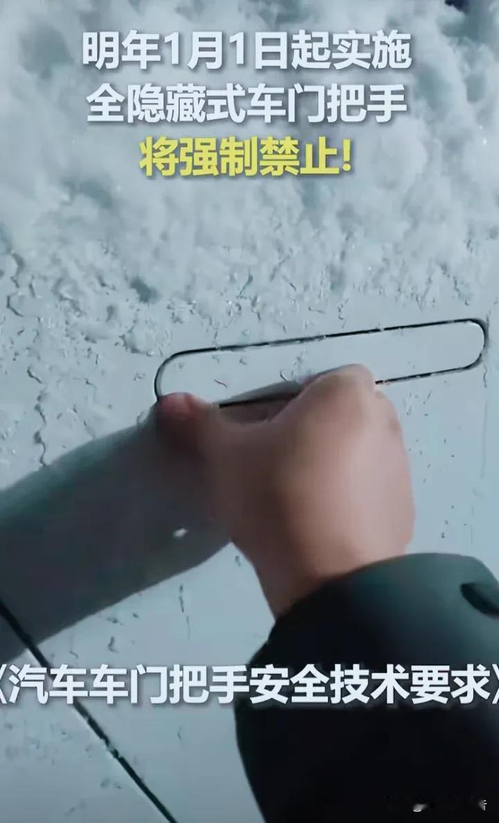汽车新新国标发布,2027年1月1日起隐藏式门把手将被禁止。 隐藏式门把手的设计源于特斯拉汽车。在燃油车时代根本就没有听说过门把手还有隐藏款。 但隐藏式门把手凸显了车身整体流畅线性,门把手隐藏于车身内确实看起来美观多了,因此国内车企纷纷模仿。小米、小鹏等车型都有用上隐藏式门把手。 但在汽车因碰撞、异常断电等紧急情况下,隐藏式车门从外面无从下手,从里面也无法或者很难打开,给救援和自救带来了新的风险隐患。 美观不能影响安全,安全应该是车企第一生命线。(图片引用自网络)