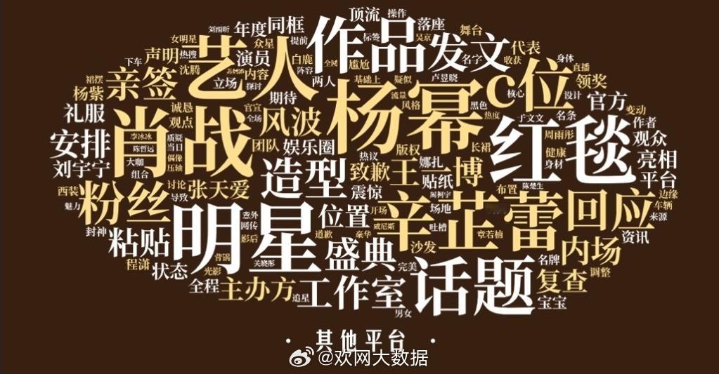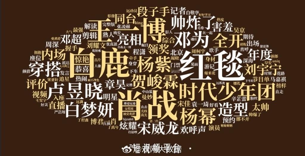 微博之夜 微博之夜欢网热度词云🈶️微博平台:肖战 王一博 刘宇宁 杨幂 邓为D 登陆少年组合 白鹿 讨论度最高!短视频平台:肖战 白鹿 王一博 卢昱晓 邓为 杨幂 杨紫 成绩突出!其他平台:杨幂 肖战 辛芷蕾 王一博 张天爱 刘宇宁 杨紫 最为亮眼!