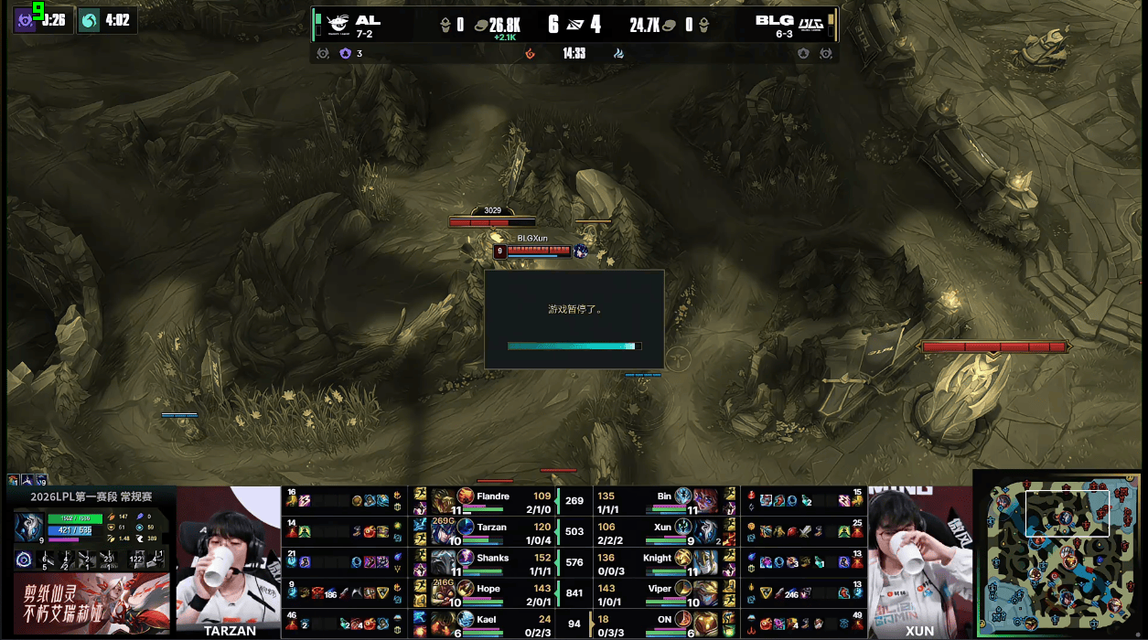 BLG对阵AL第三局,游戏进行至14分钟时发生暂停(已恢复)