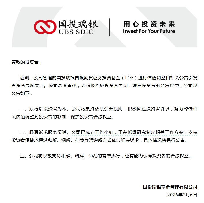 2月6日,国投瑞银基金管理有限公司发布关于积极解决白银(LOF)基金投资者诉求有关事项的公告。近期,公司管理的国投瑞银白银期货证券投资基金(LOF)进行估值调整和相关公告引发投资者高度关注。公司高度重视,为积极回应投资者关切,维护投资者的合法权益,公司现公告如下:
