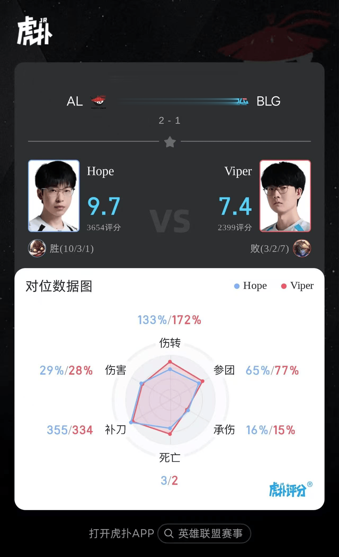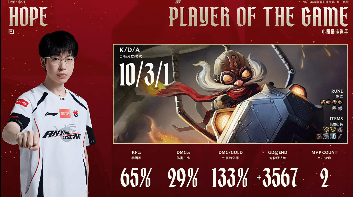Hope飞机打出10/3/1战绩,斩获AL对阵BLG第三局MVP