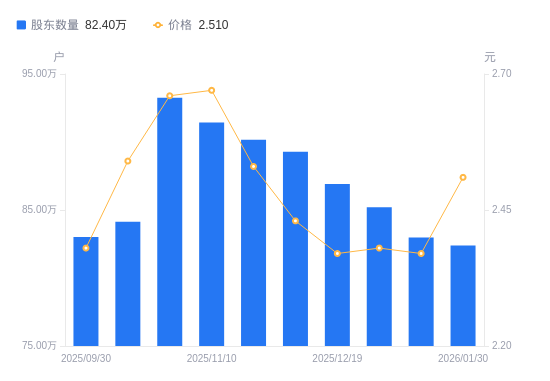 日期A股户数(户)流通A股户均持股数(股)户均持股市值(万元)2026-01-2082986337814.438.962025-12-3185206636829.078.772025-12-1986914136105.538.562025-11-2889283035147.568.542025-11-2090172634800.818.802025-11-1091427034323.349.162025-10-2093253633651.038.952025-10-1084144937293.769.472025-09-3083018837799.639.002025-09-1984654337069.358.82